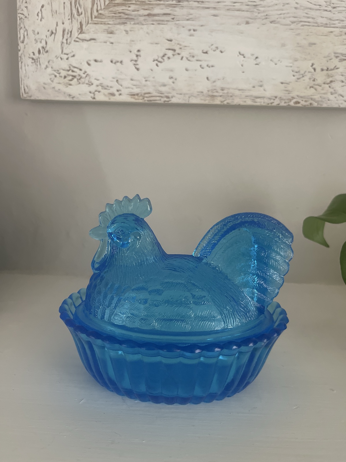 The tradition of the glass hen dates back to the late 1800s when they were often used as promotional containers for mustard or baking powder.