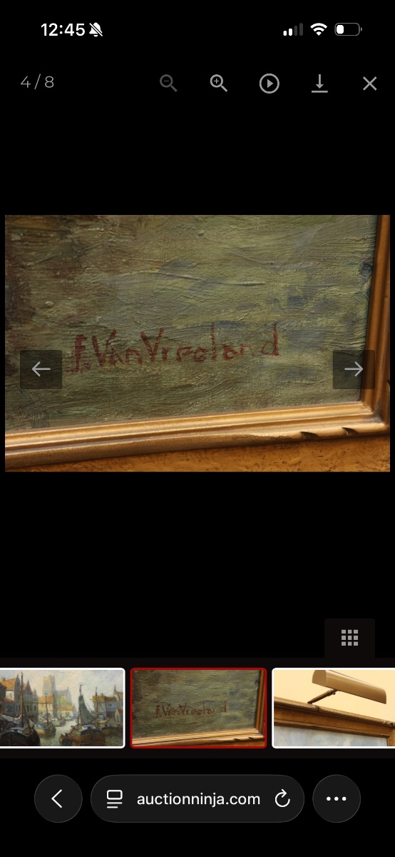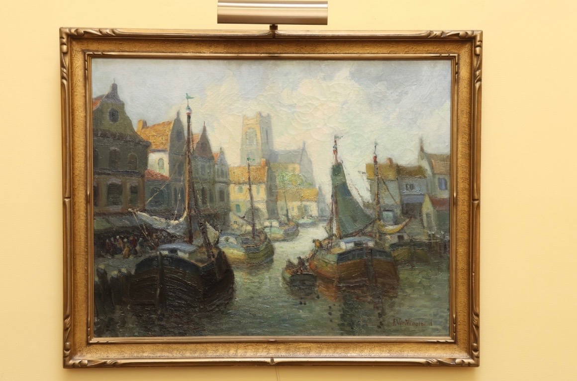 The painting appears to be in good vintage condition with stable craquelure consistent with its age. Vreeland's market is stable, with European harbor scenes being among his most desirable subjects.