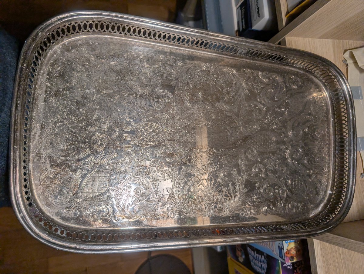 The tray shows significant tarnish and some 'pitting' or wear to the silver plating, particularly visible in the duller grey patches where the base metal is beginning to… Silverplate values are currently modest as formal entertaining has become less common, but large gallery trays remain popular for modern 'bar cart' styling.