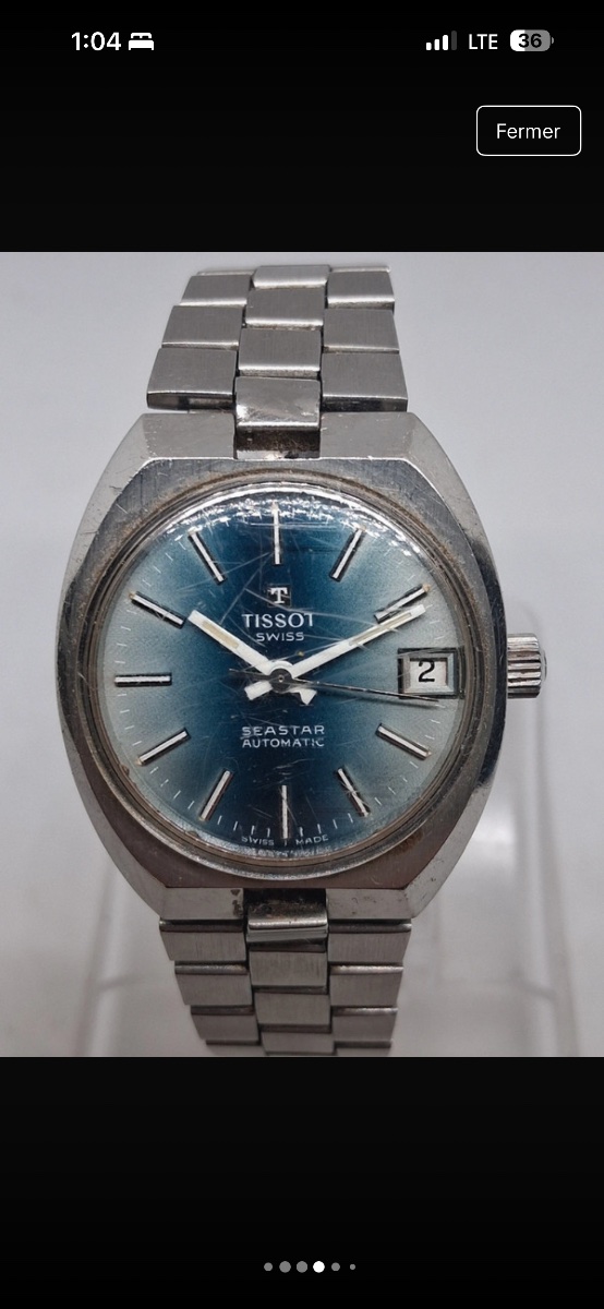 The acrylic crystal is heavily scratched, which is common for this era but obscures the beautiful dial. Value is driven by the highly desirable blue gradient dial and the 'Seastar' branding.