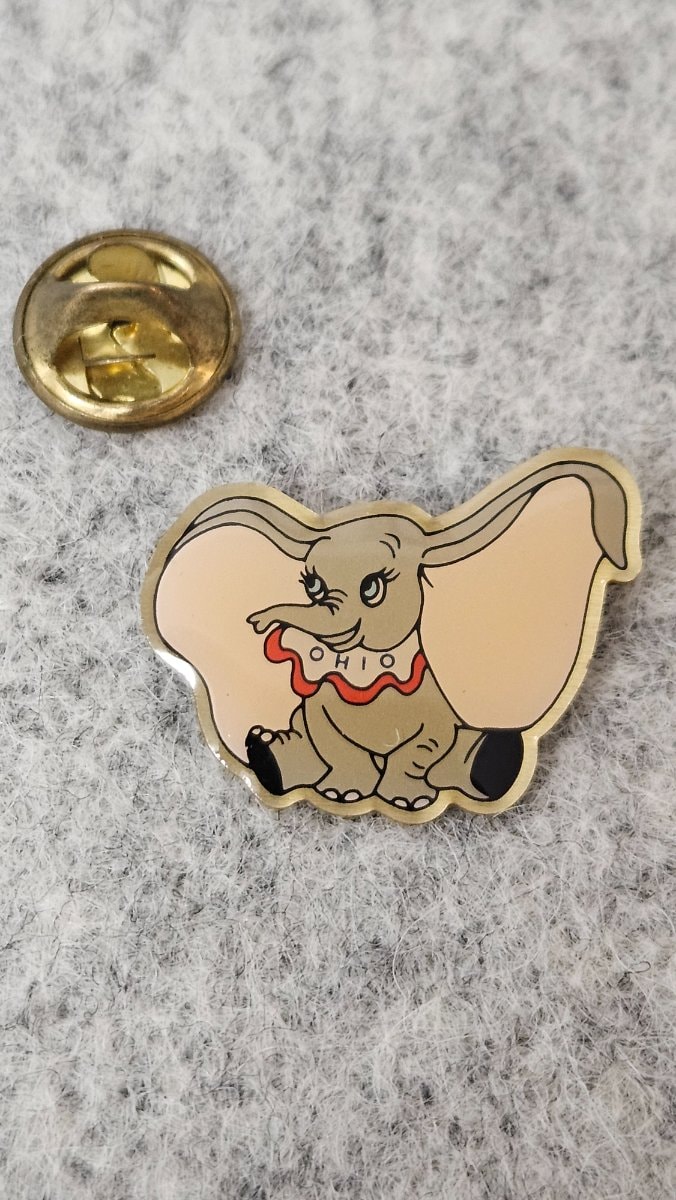 The pin appears to be in good vintage condition with minor surface wear and some light oxidation on the butterfly clutch. As an unsigned, likely unofficial piece, its value is primarily sentimental or for a niche 'Ohio' or 'Dumbo' collector.