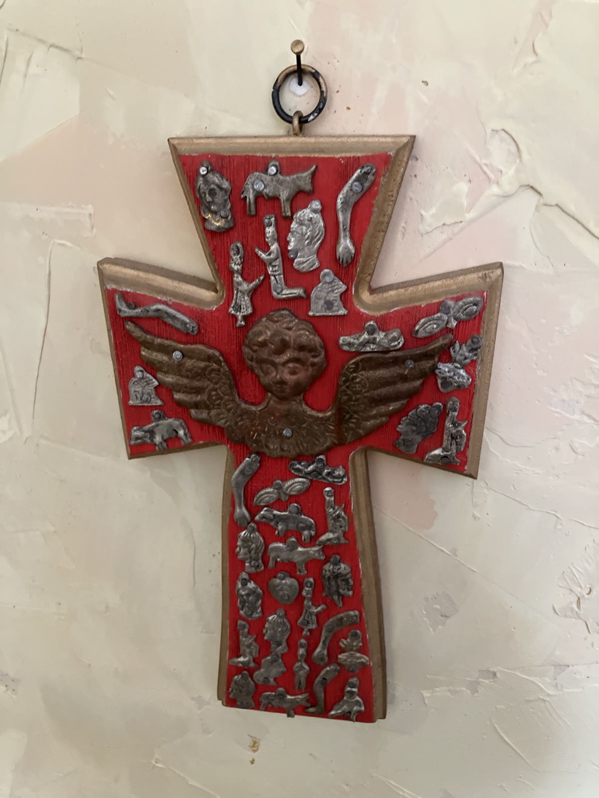 This is a vibrant example of Mexican devotional folk art, featuring a hand-painted wooden cross adorned with dozens of 'milagros' (miracles).