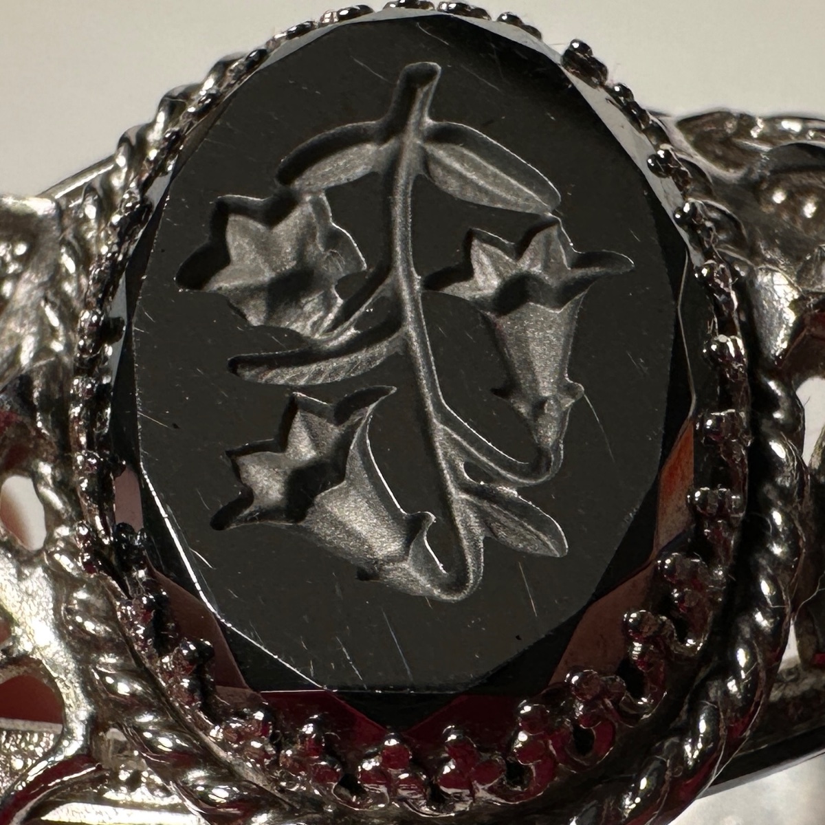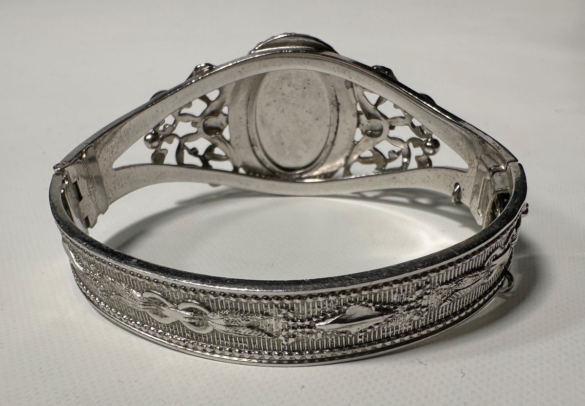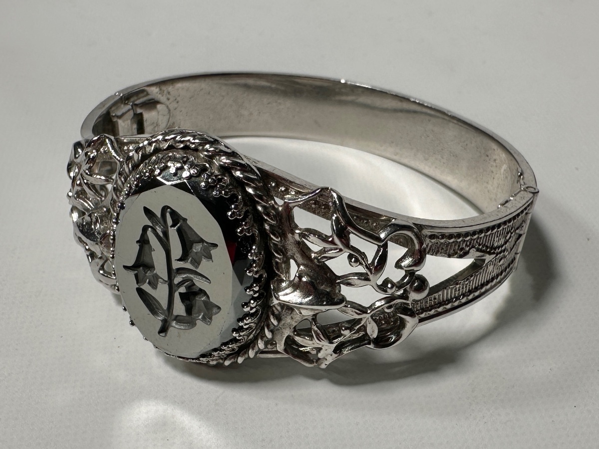 A striking silver-toned hinged bangle featuring a central oval hematite stone with a deep intaglio carving of bellflowers.