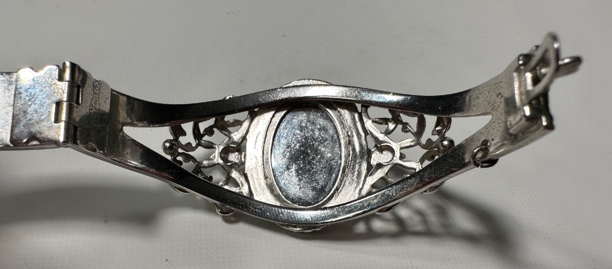 The silver plating appears remarkably well-preserved with minimal 'pitting' or base-metal show-through. Whiting & Davis is a respected name, and hematite intaglios are among their more popular designs.