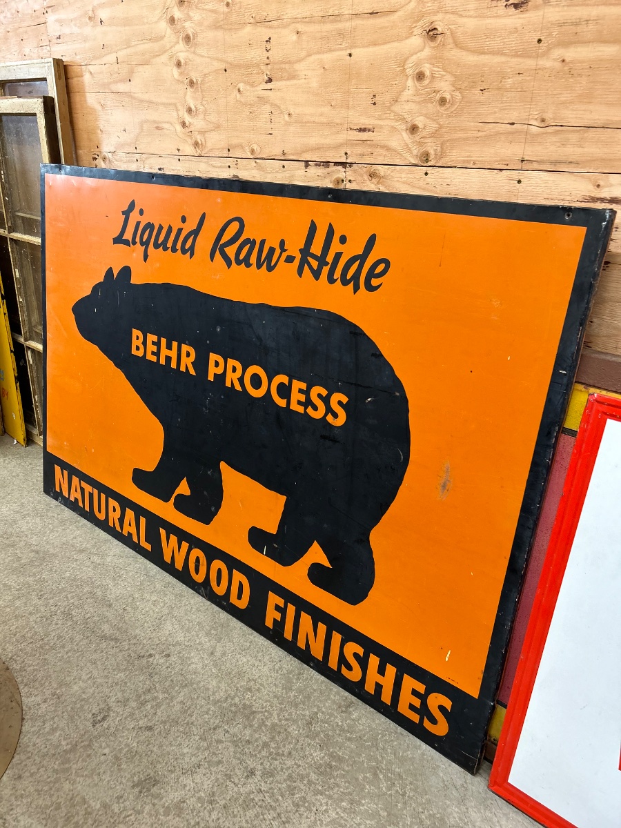 A massive, high-contrast porcelain enamel advertising sign featuring the early 'Liquid Raw-Hide' branding and the iconic bear silhouette.