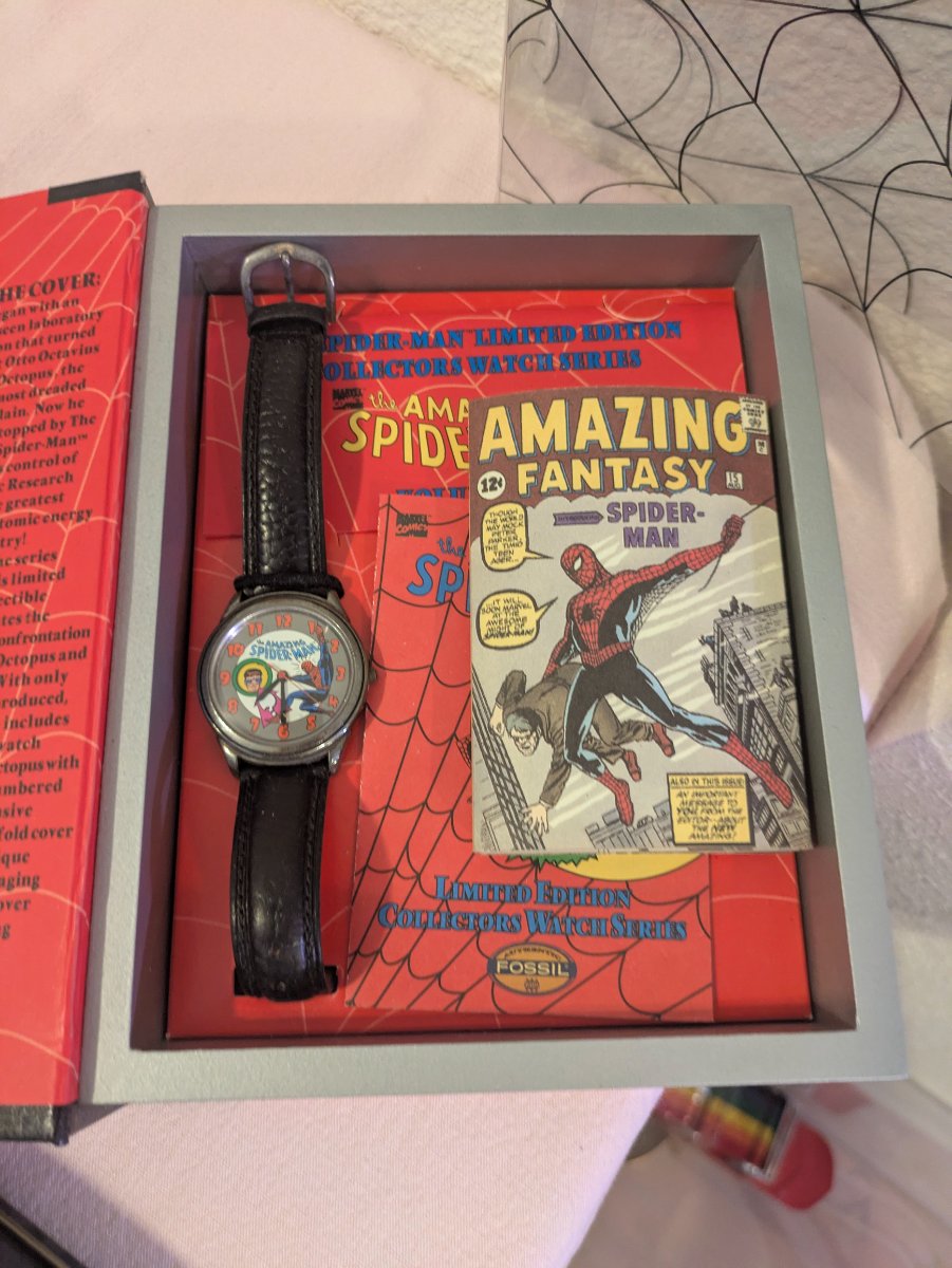This is a meticulously curated collector's set featuring a quartz timepiece with a multi-layered dial depicting Spider-Man in combat with Doctor Octopus.