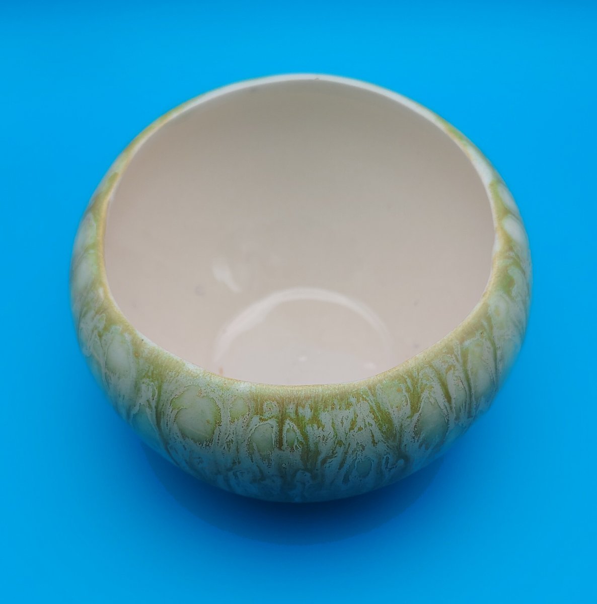 This is a classic example of 'flow glaze' or 'drip glaze' ceramics, featuring a bulbous, organic form designed to bring nature indoors.