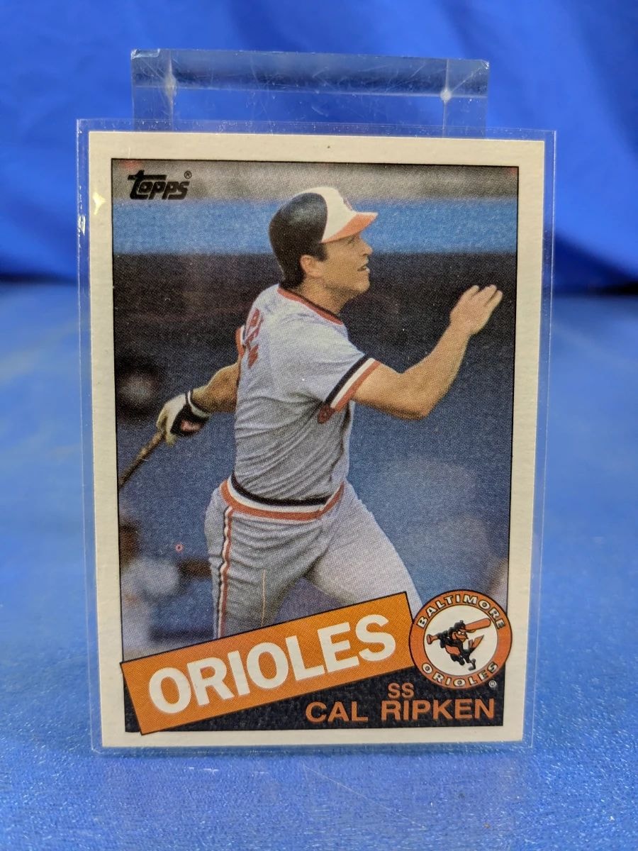 A classic third-year card of Hall of Famer Cal Ripken Jr., featuring the iconic 1984 Topps design with its bold diagonal team name and secondary circular logo.