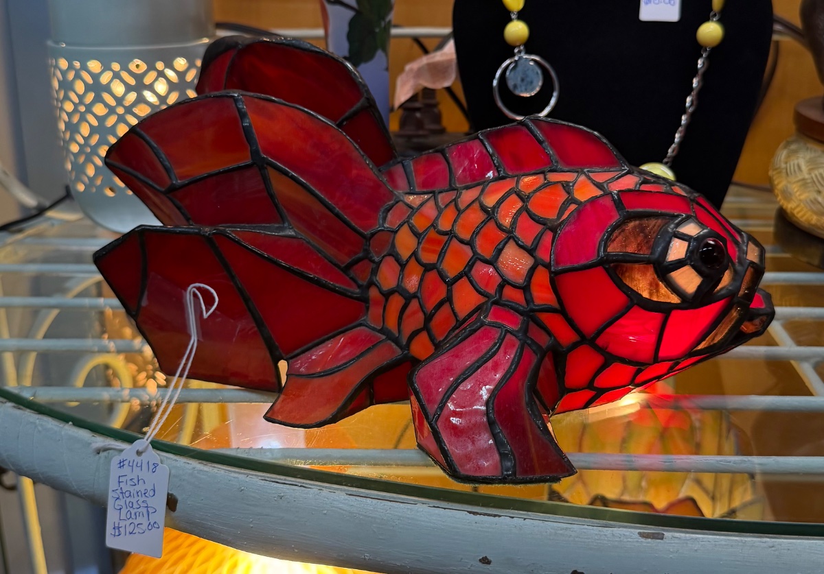 This is a vibrant figural accent lamp crafted in the form of a Ryukin goldfish, utilizing the labor-intensive copper foil stained glass method.