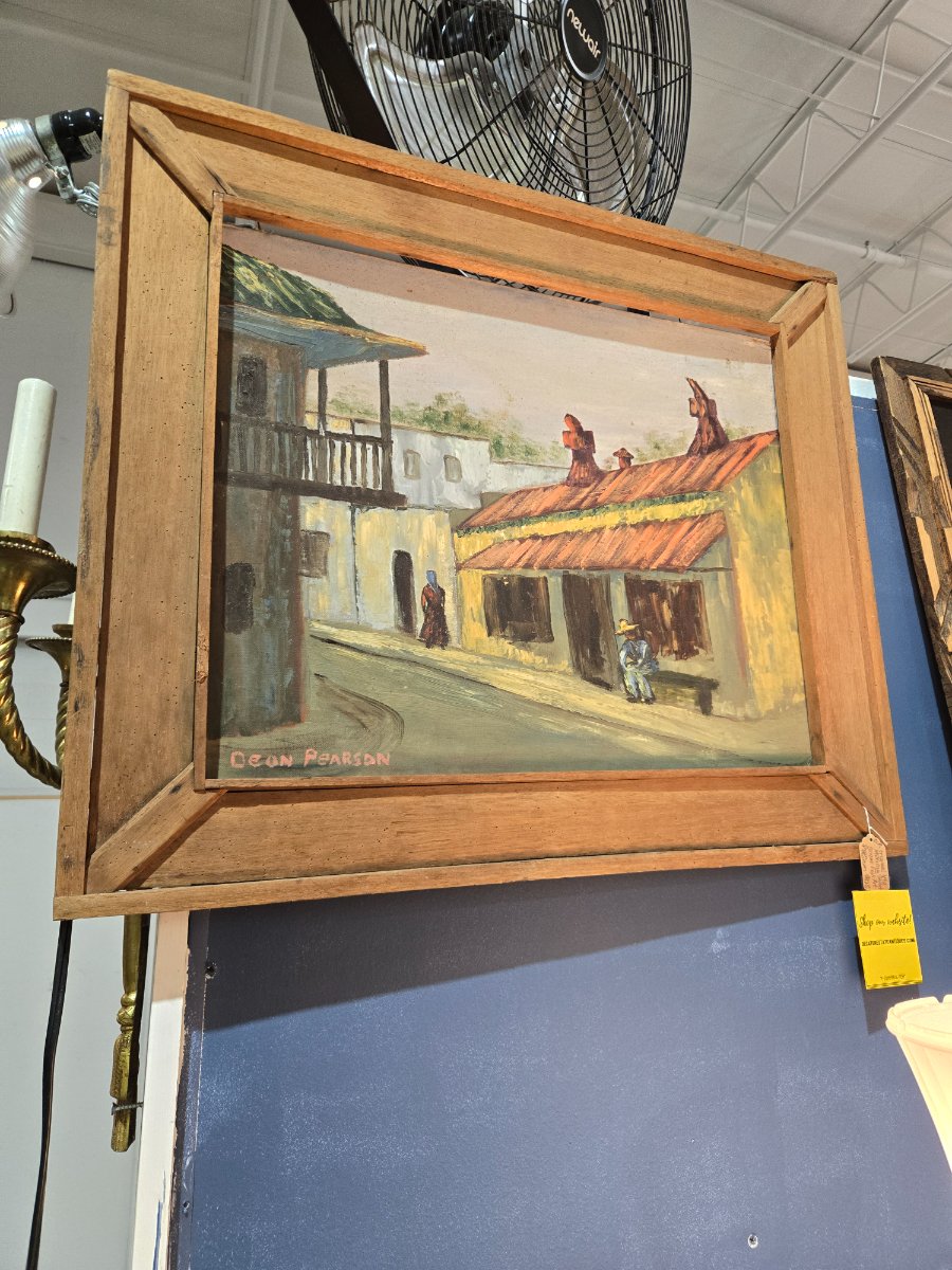 A vibrant, textured oil painting on board depicting a sun-drenched village street scene, signed by the artist Deon Pearson.