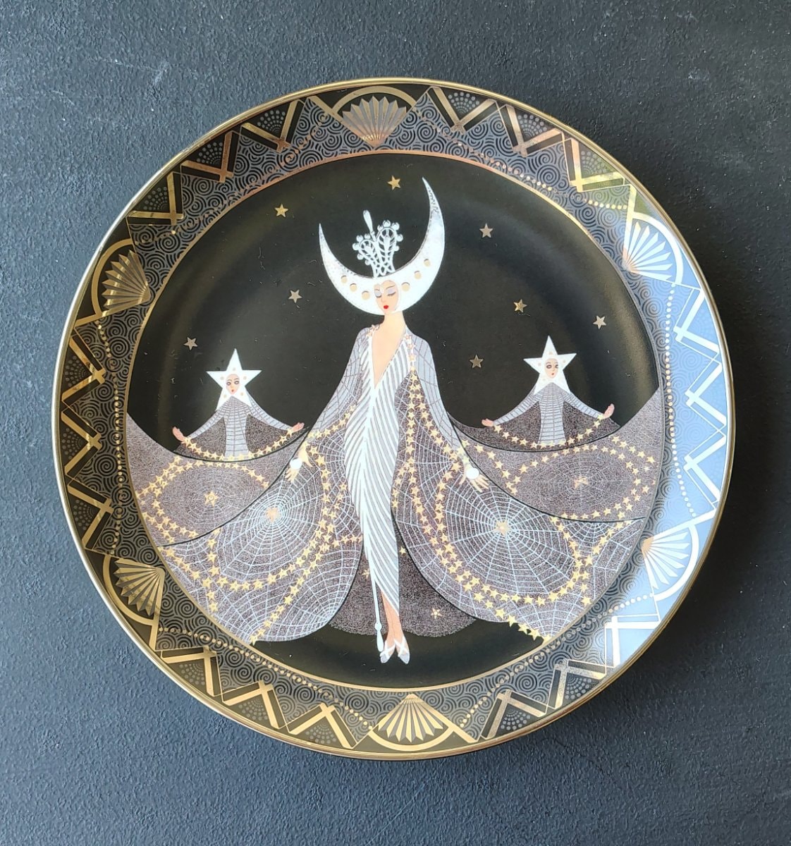 A stunning fine porcelain decorative plate featuring the iconic 'Moonlight and Stars' motif by the legendary artist Erté.