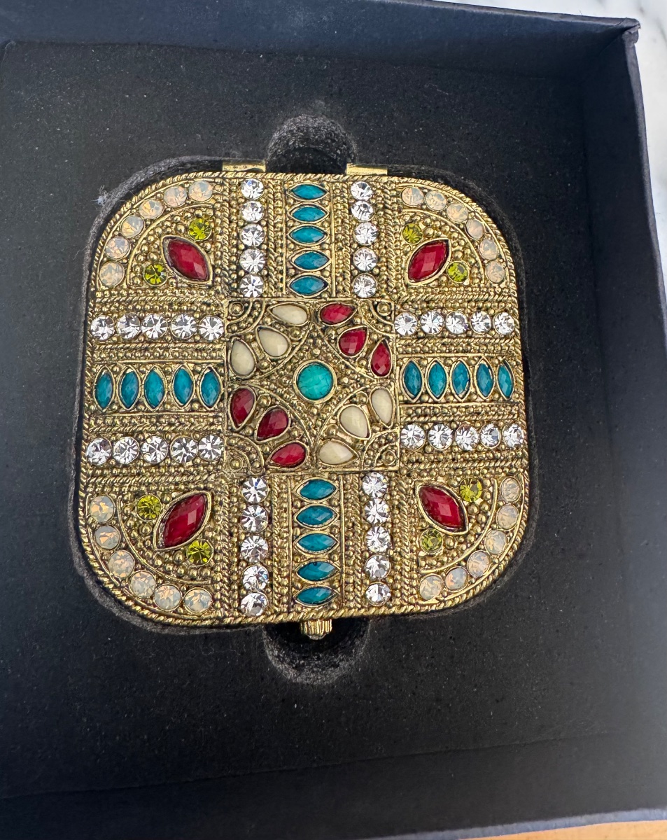 A lavishly decorated metal compact or trinket box featuring intricate filigree and a vibrant array of multi-colored crystals and cabochons.