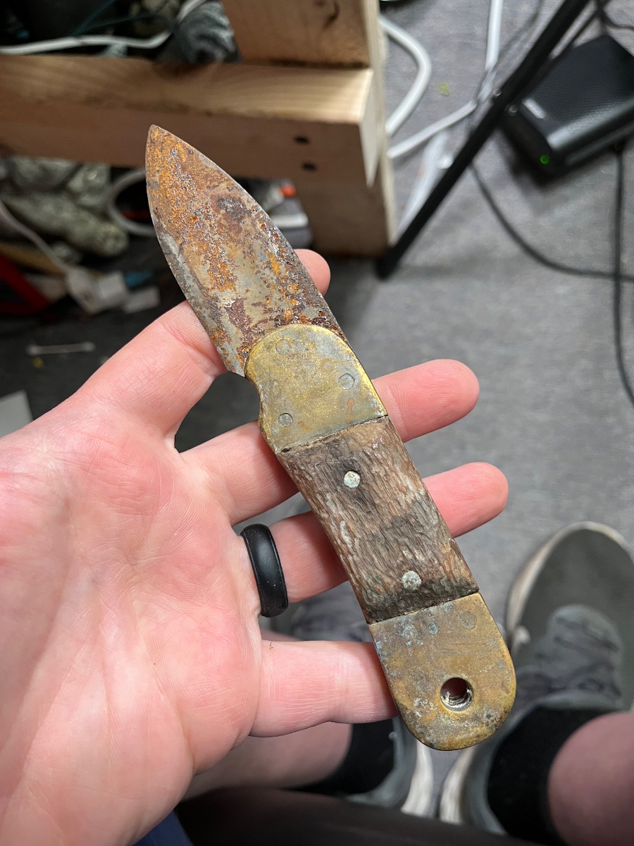 The knife is in 'as-found' condition with significant surface rust and pitting on the blade, along with heavy verdigris on the brass and desiccation of the wood scales. In its current heavily rusted state, the value is primarily as a restoration project or a sentimental keepsake.