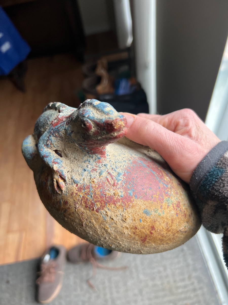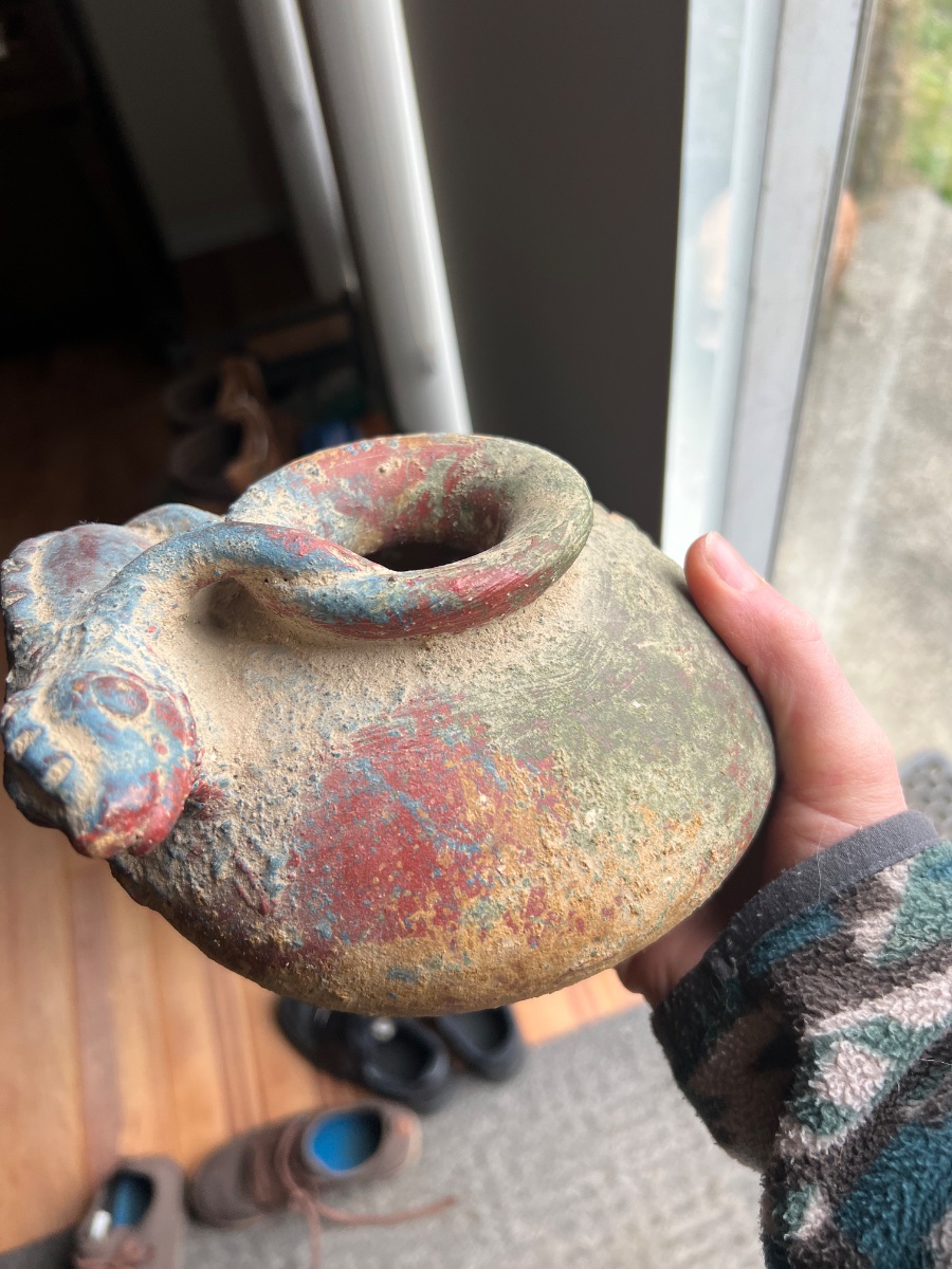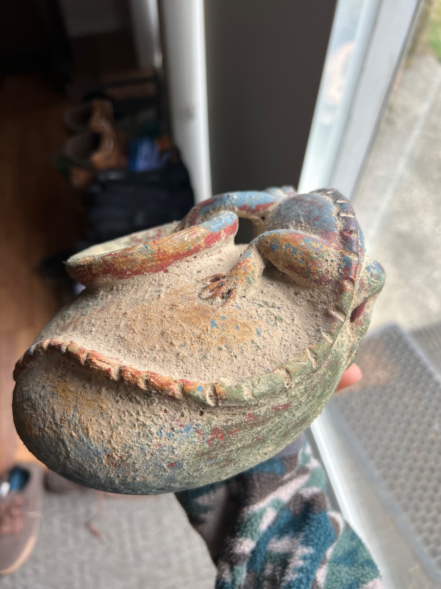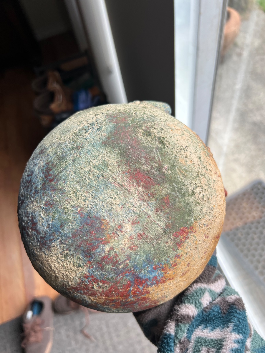 The piece shows significant surface encrustation and some pigment loss. Much of this 'wear' is likely intentional to create an aged, 'excavated' appearance. As a decorative 'in the style of' piece rather than a provenanced archaeological artifact, the value is based on its aesthetic appeal and folk-art craftsmanship.