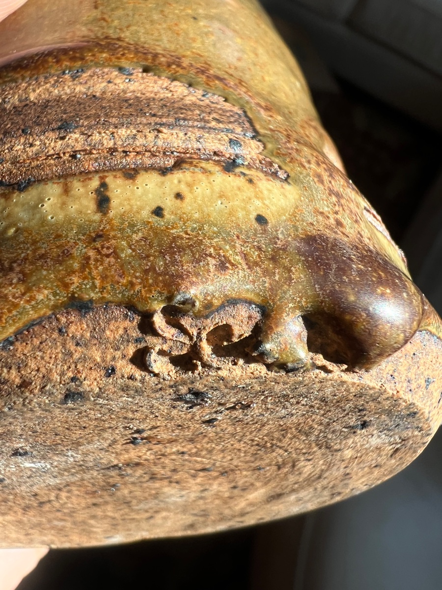 The piece appears to be in excellent original condition. The 'pitting' and 'craters' in the dark areas are intentional 'volcanic' glaze effects, not damage. Value is driven by the recognition of the 'SC' mark as Stephen Cunningham and the current high demand for 1970s Brutalist-style studio pottery.