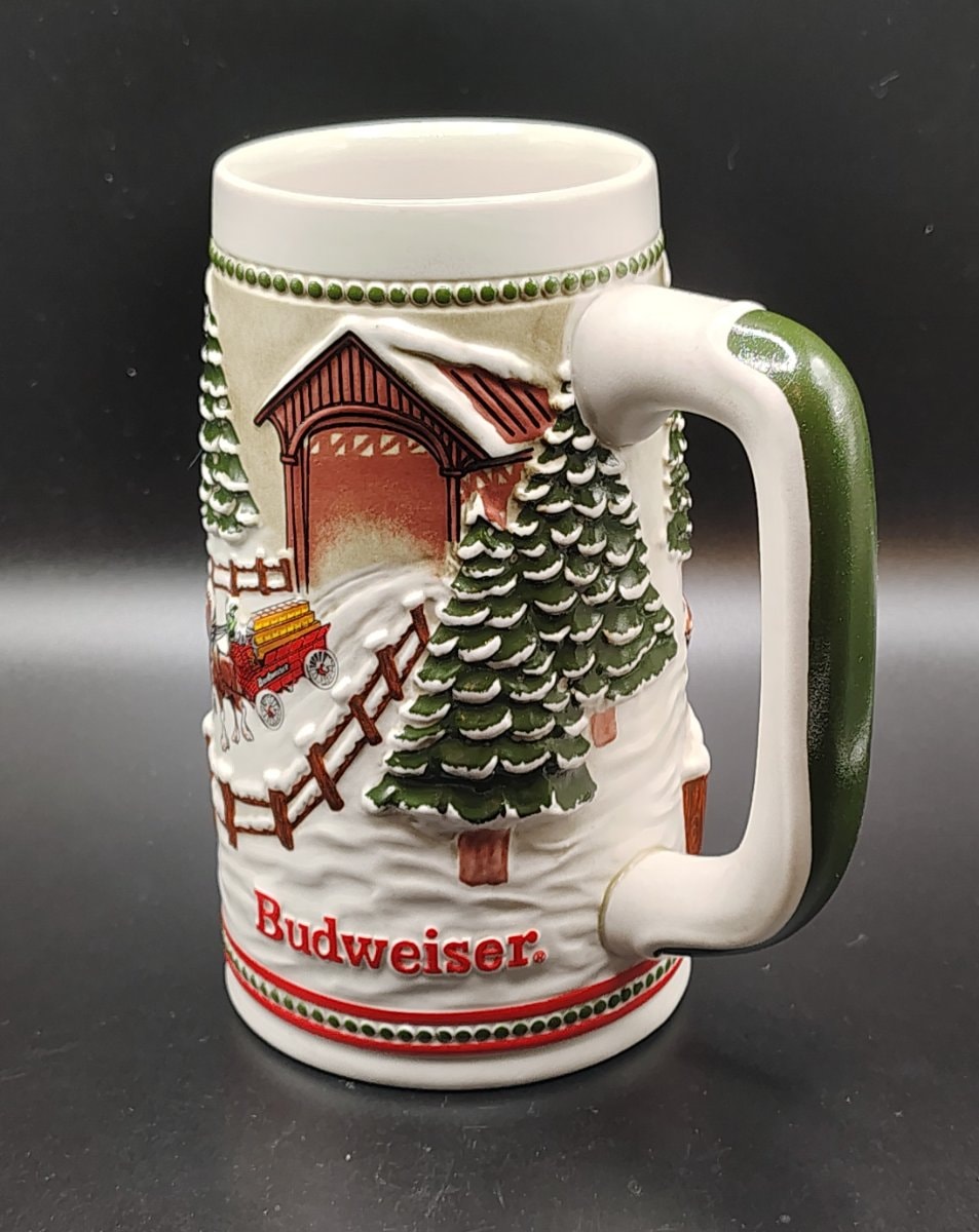 A classic ceramic relief beer stein featuring the iconic Budweiser Clydesdales hitch.