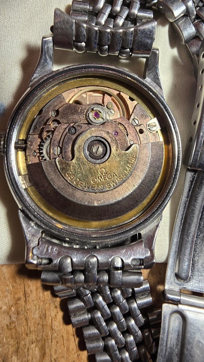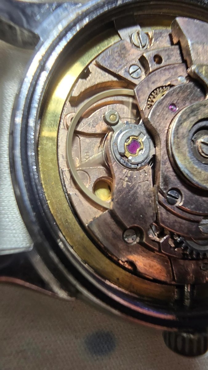 The acrylic crystal is heavily scratched and obscured, which is common for vintage pieces but easily fixed by a specialist. The case shows honest wear consistent with age, and the movement appears relatively clean but should be professionally serviced to prevent damage to the vintage lubricants.