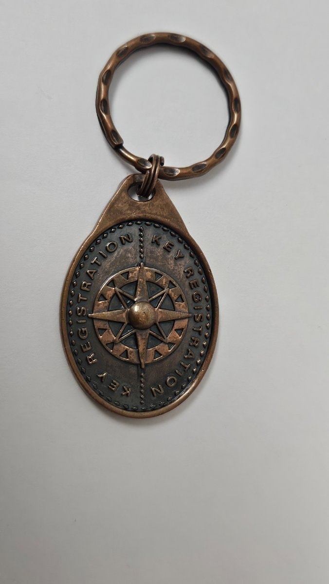 A die-struck metal key fob featuring a compass rose motif and a unique serial number for a lost-and-found recovery service. This piece represents a pre-digital era of security where the U.S.