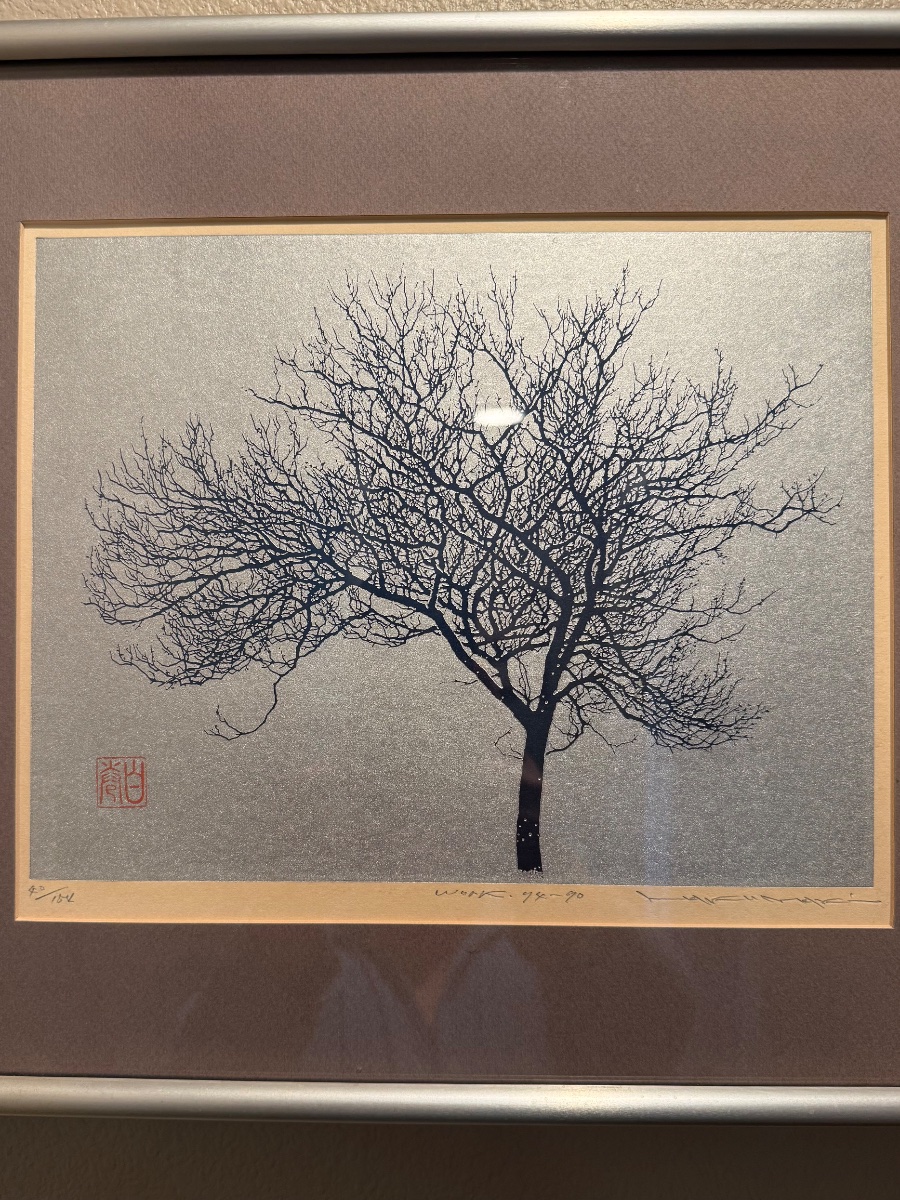 The print appears to be in very good condition with the metallic field retaining its luster. The pencil signature and numbering are clear and unfaded. Haku Maki's tree subjects are among his most sought-after works.
