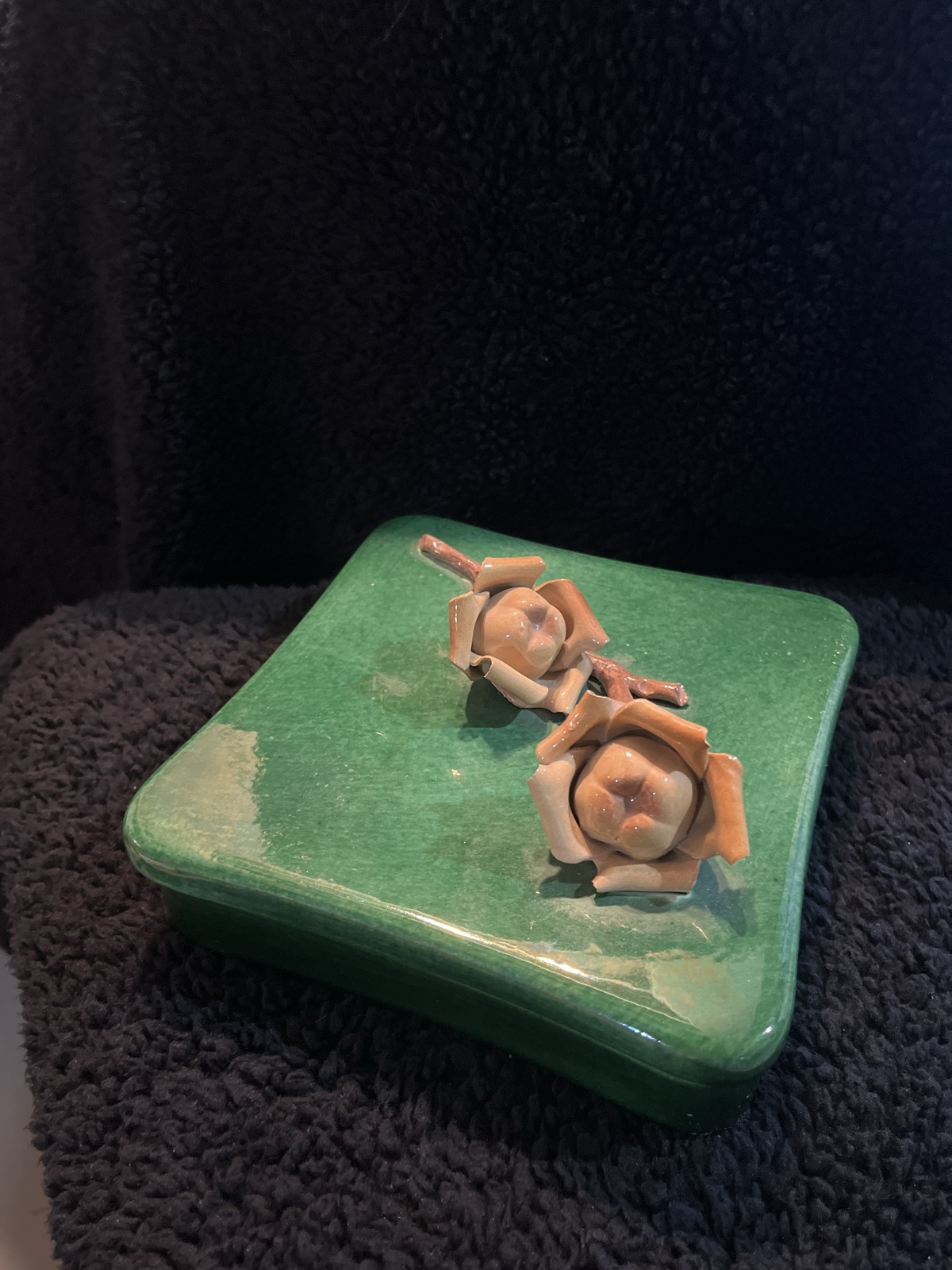 The photos show some surface residue or light wear on the green glaze that may benefit from a gentle cleaning. Unsigned mid-century pottery of this type is valued primarily for its decorative appeal and the 'survival' of its delicate parts.