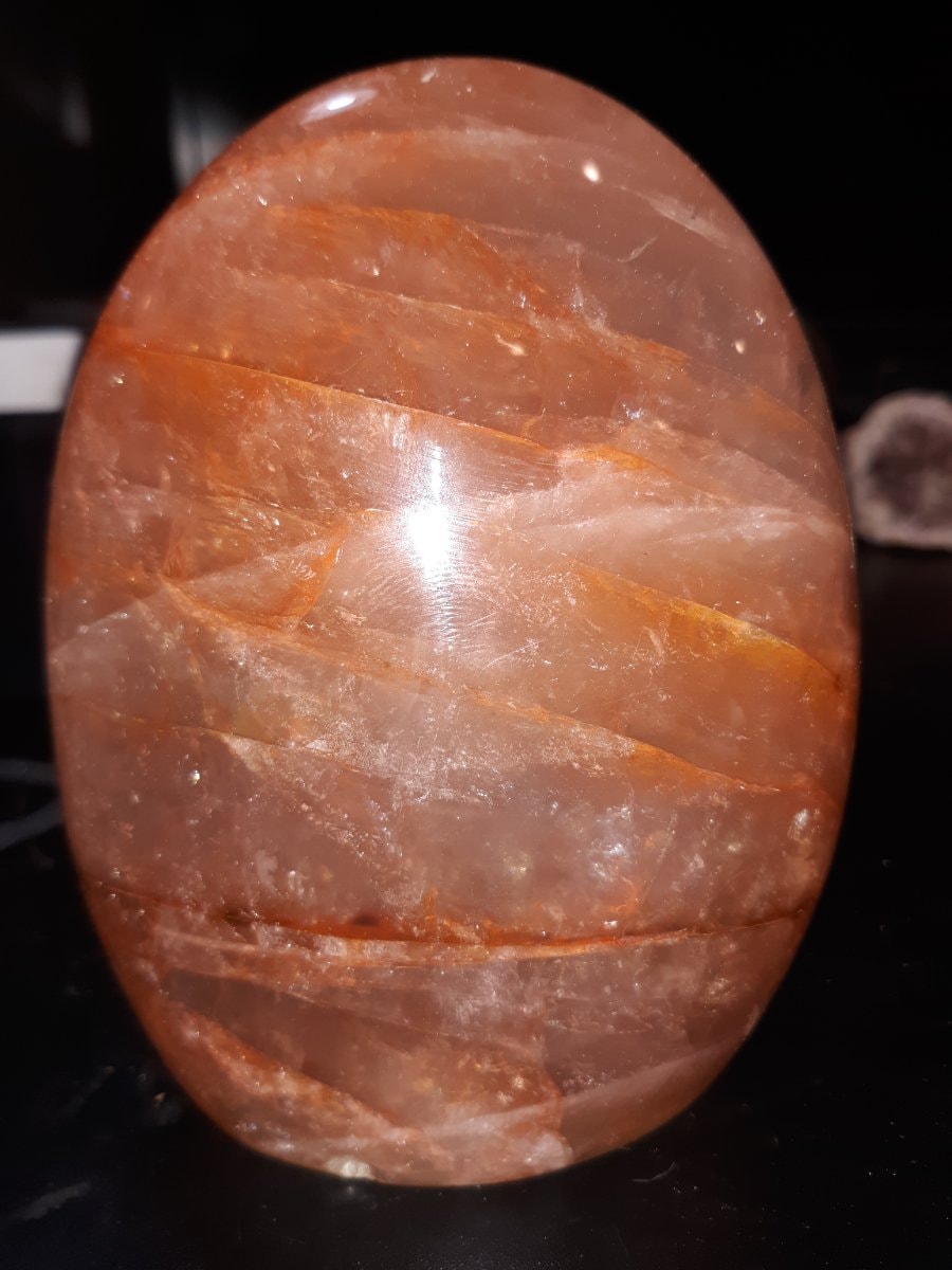 This is a beautifully polished specimen of Hematoid Quartz, colloquially known as 'Fire Quartz' due to its vibrant internal inclusions.