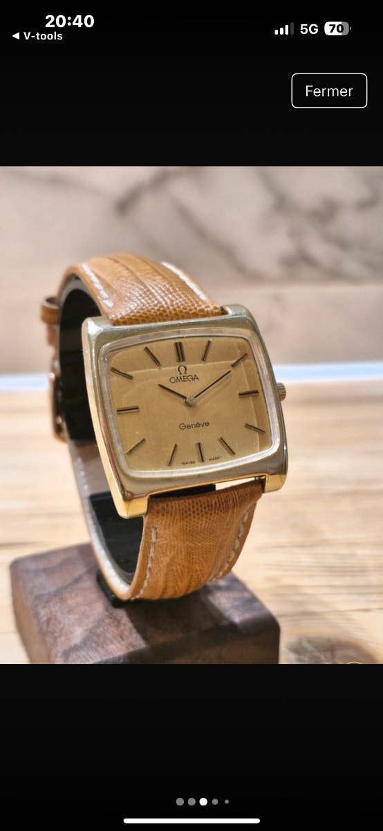 A striking example of 1970s 'TV-style' horology, this Omega Genève features a gold-toned cushion case and a minimalist champagne dial.