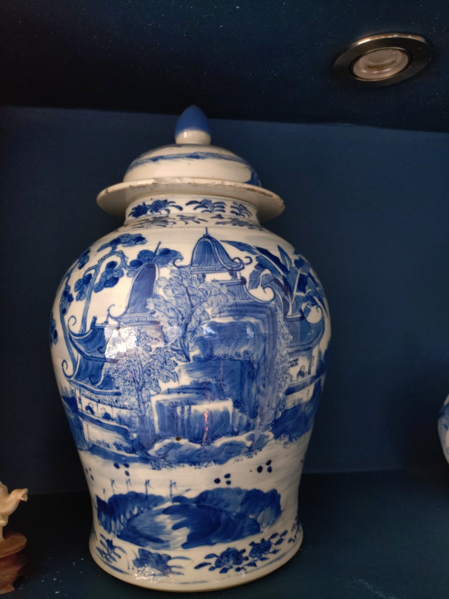 A classic ovoid porcelain jar featuring a hand-painted 'Shan Shui' (mountain-water) landscape in cobalt blue underglaze.