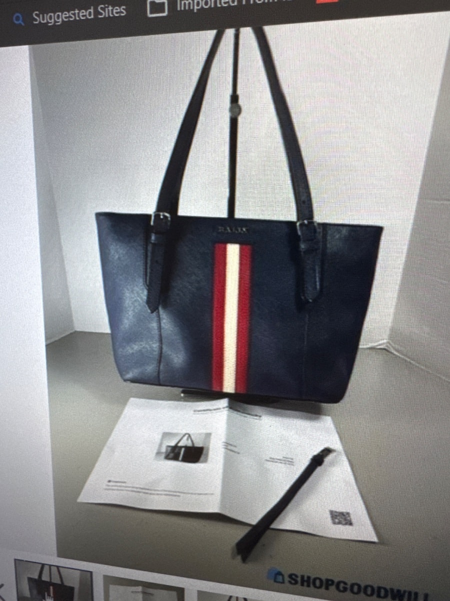 A sophisticated navy blue leather tote featuring the iconic red-and-white 'Trainspotting' webbing stripe, a hallmark of Swiss luxury house Bally.