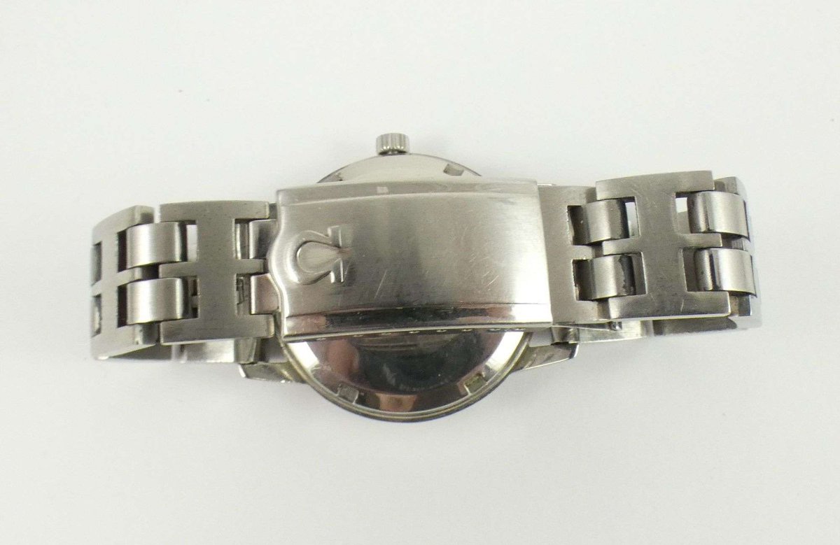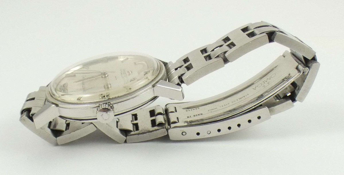 The watch shows honest wear consistent with age, including surface scratches on the stainless steel case and acrylic crystal. Value is driven by the original dial condition and the presence of the period-correct Omega-signed bracelet.