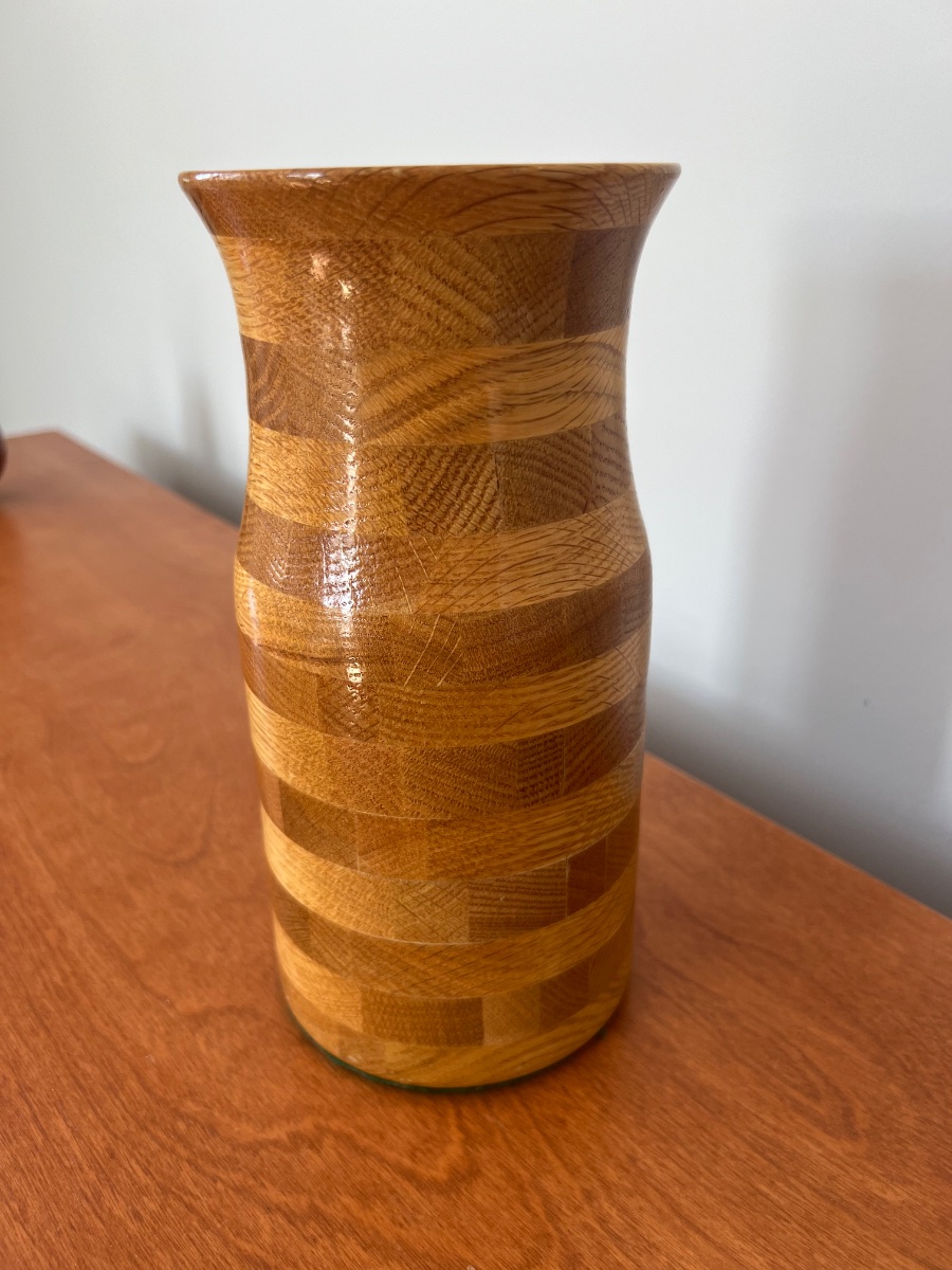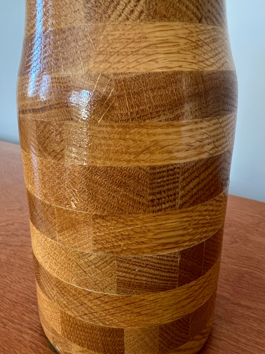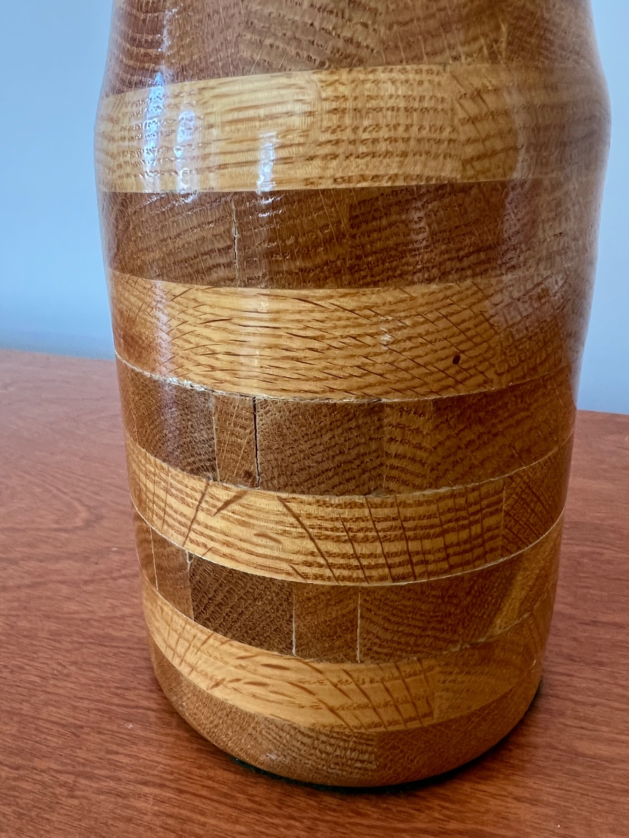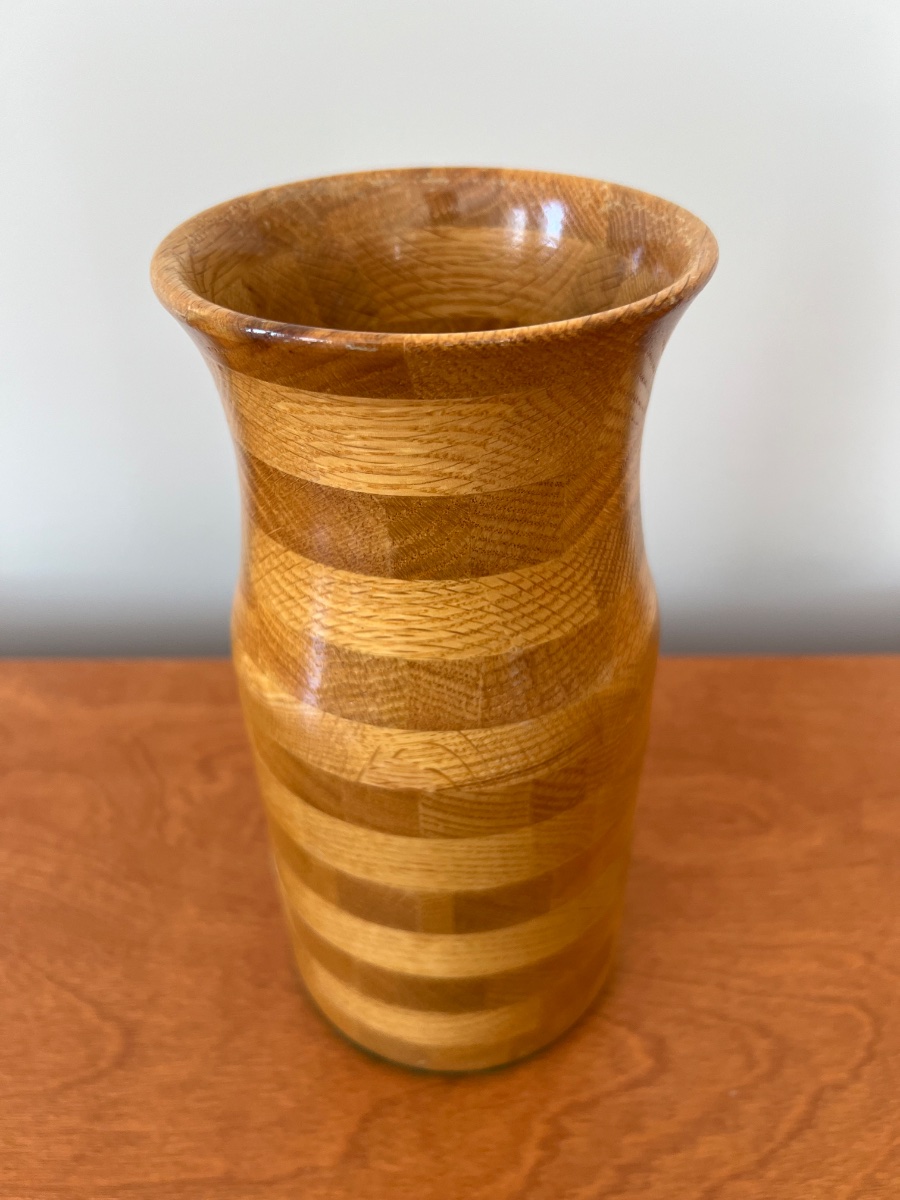 This is a meticulously crafted segmented wood vase, created by gluing dozens of individual oak blocks into rings before shaping them on a lathe.