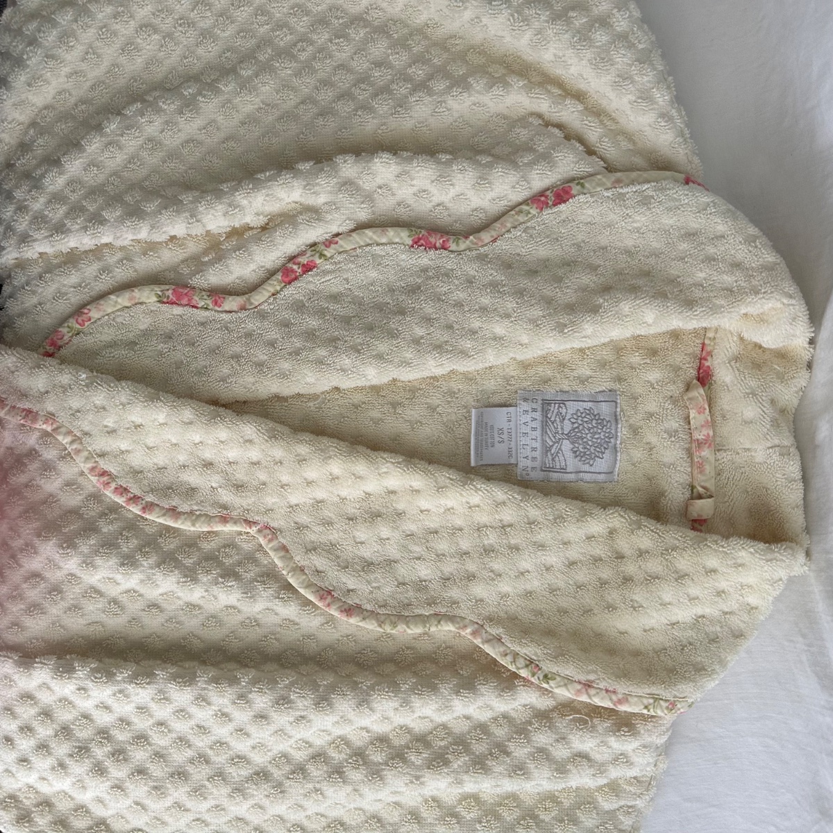 A classic example of the 'English Country House' aesthetic, this robe features a heavy-weight textured cotton waffle weave accented by a delicate rose-patterned bias binding.