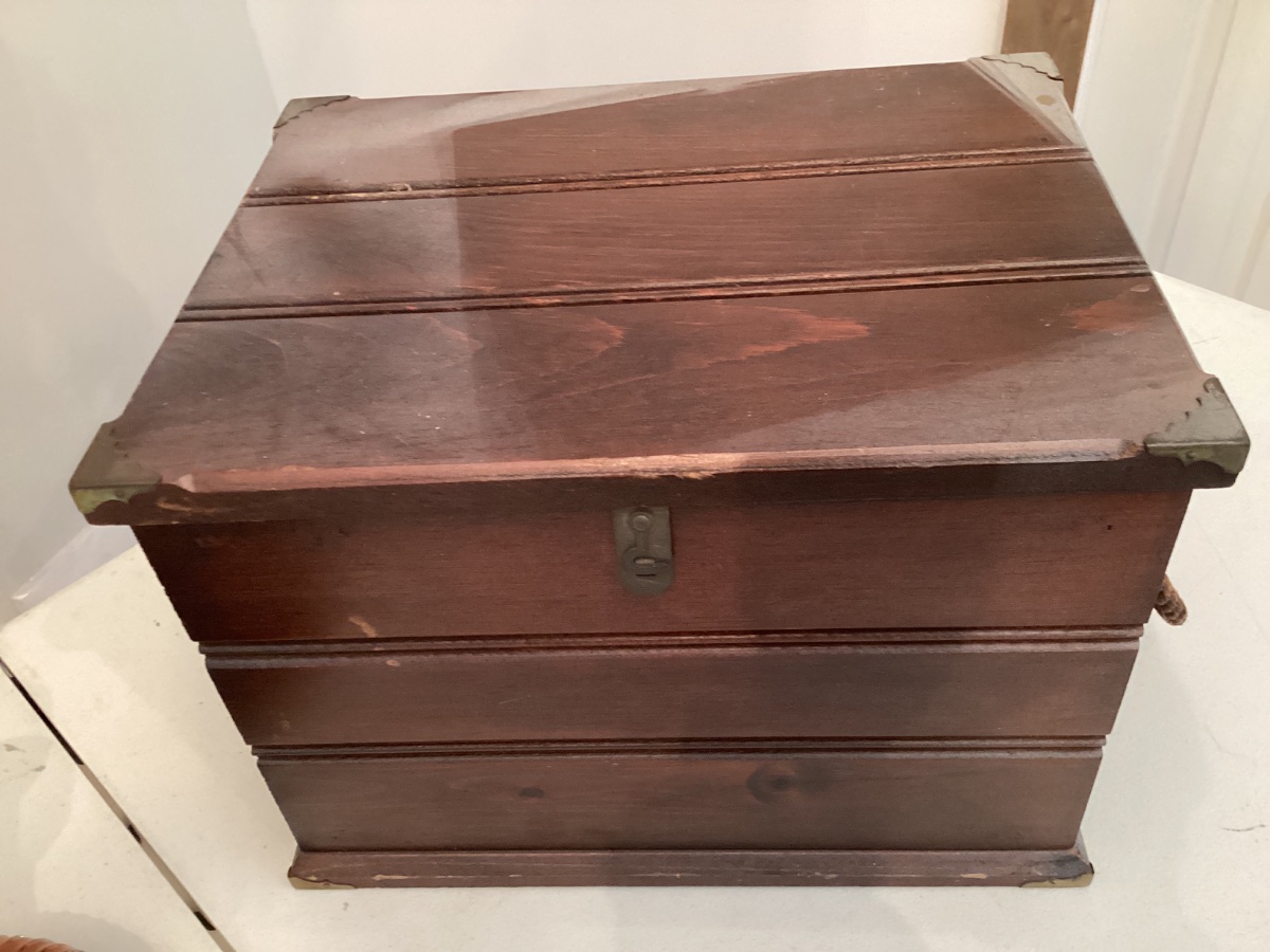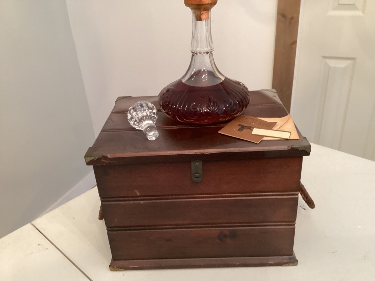 The wooden chest shows minor surface scuffing and wear to the finish consistent with 40 years of storage. Value in the 'dusty bourbon' market is driven by the age of the liquid and the completeness of the set.