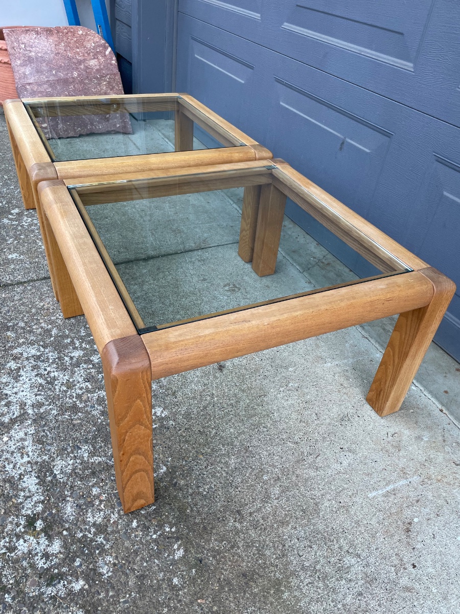 A striking pair of 'Soft Modern' side tables featuring thick, radiused oak frames and recessed tempered glass tops.