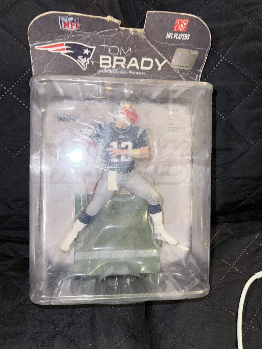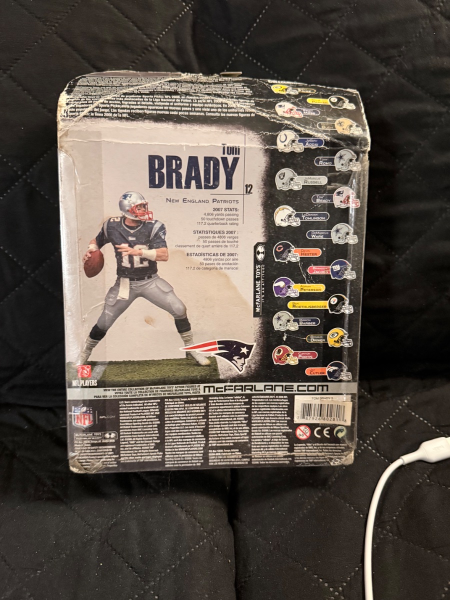 The packaging is in poor to fair condition, showing significant crushing on the bottom corners, heavy creasing on the header card, and some scuffing on the plastic… While Tom Brady is the most collectible player in the hobby, value in the toy market is heavily dictated by packaging condition.