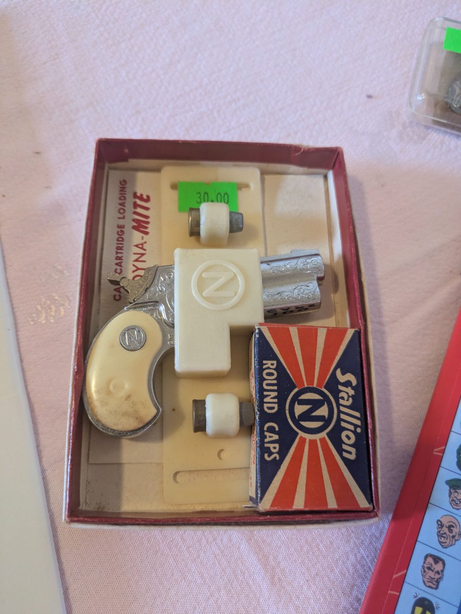 The die-cast metal shows minor surface oxidation and 'pitting' consistent with age, but the engraving remains sharp. While the gun itself is common, the presence of the original box insert and the Stallion cap box significantly increases the value to collectors.