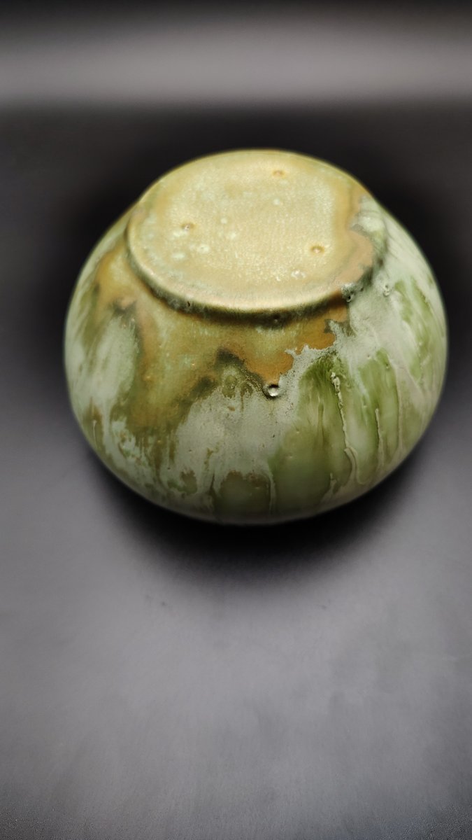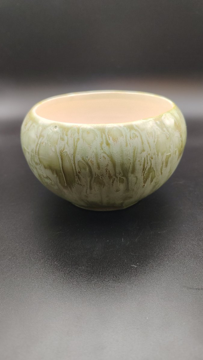 A classic example of American Art Pottery featuring a sophisticated 'frosted' drip glaze in mossy greens and creams.