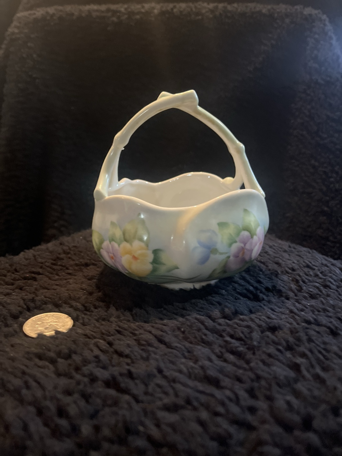A delicate porcelain 'nappy' or nut basket featuring a hand-painted floral motif and a distinctive split-twig handle.