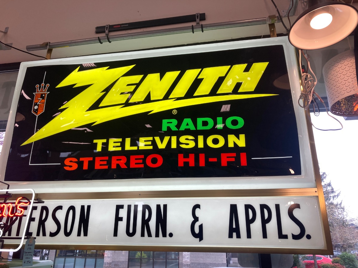Chicago-based Zenith was the undisputed king of quality in the mid-20th century, and this sign was the beacon that drew families into stores like 'Peterson Furn. & Appls.' to see the future of home entertainment.