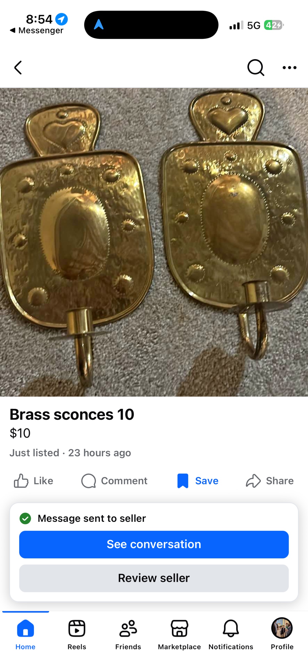 A charming pair of hand-hammered brass wall sconces featuring a traditional heart-shaped finial and a central reflective boss.