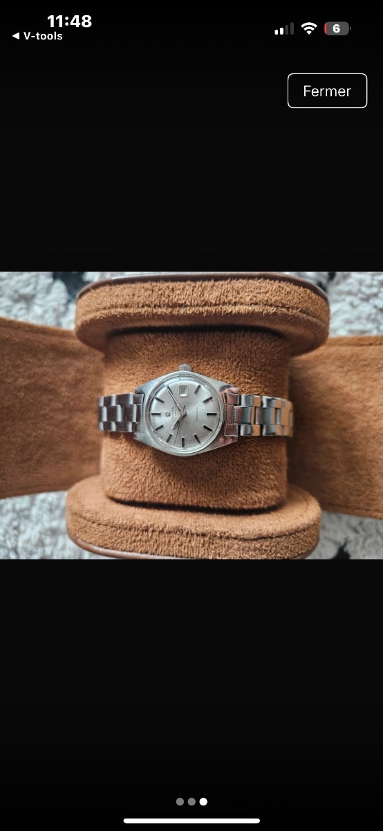 The dial shows some light spotting and patina consistent with age, and the crystal has minor surface scratches that could likely be polished out. The bracelet appears to be a period-correct style, though its original status to this specific watch is unconfirmed.