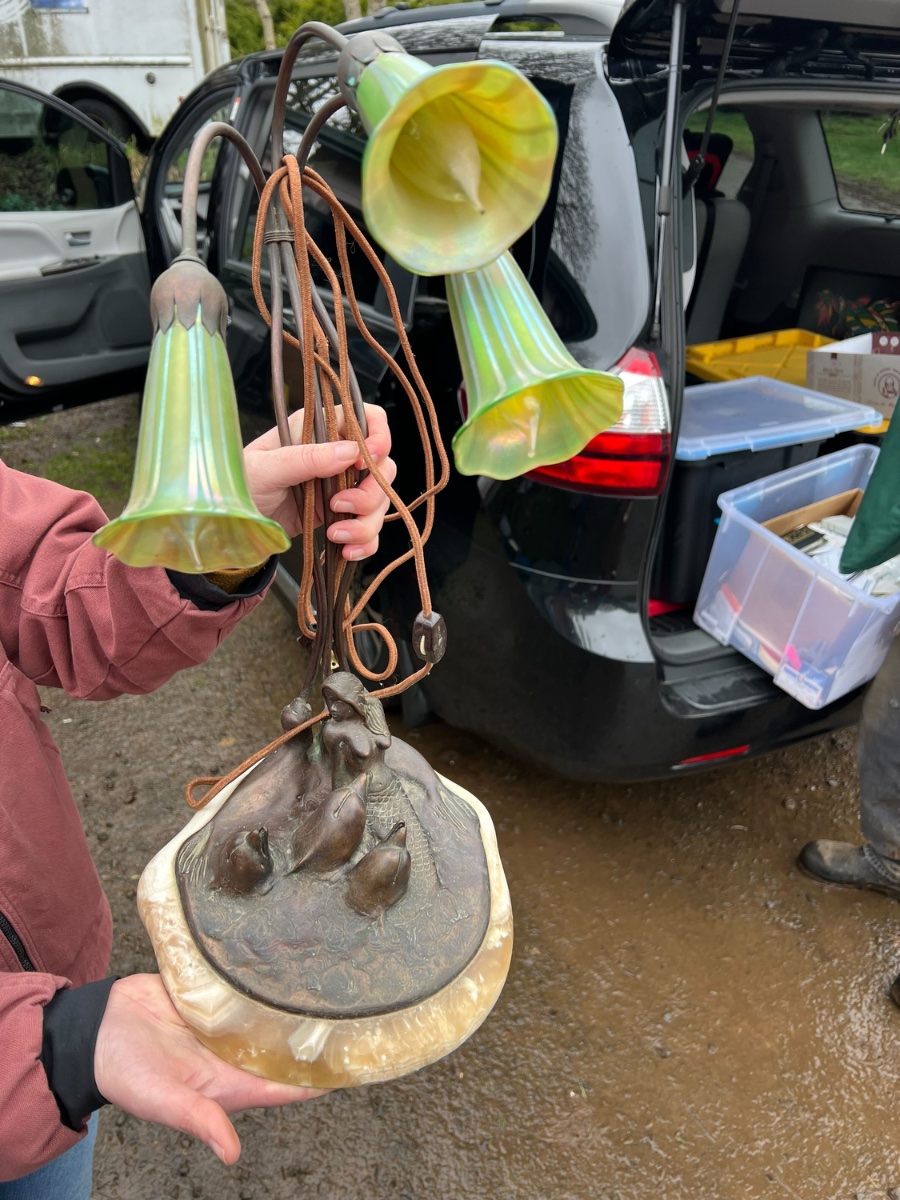 The glass shades appear to be in excellent condition without visible chips or cracks, which is the primary value driver. Value is driven by the condition of the glass shades and the detail of the figural casting.