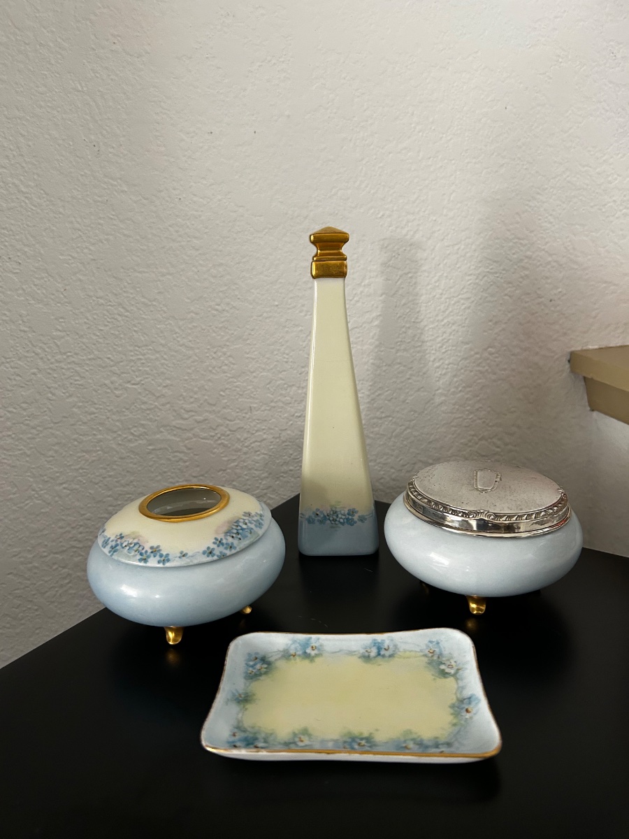 This is a classic four-piece Limoges porcelain vanity or 'dresser' set, featuring a hair receiver, a lidded powder jar, a tall perfume flacon, and a pin tray.