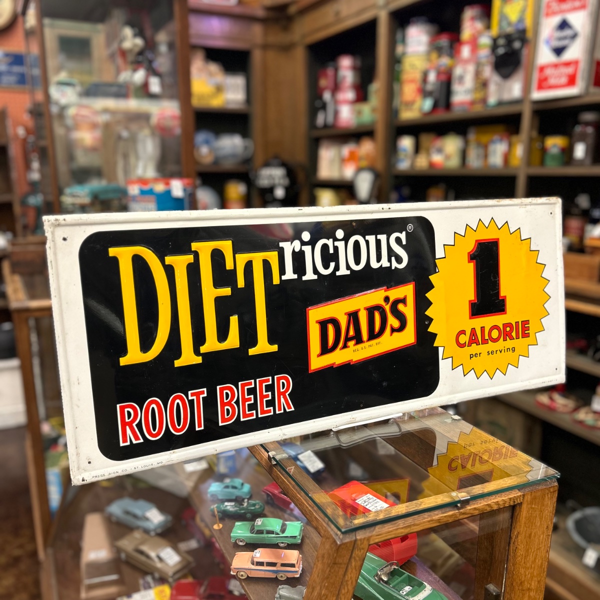 A vibrant, embossed lithographed tin advertisement featuring the clever 'DIETricious' marketing pun for Dad's Root Beer.