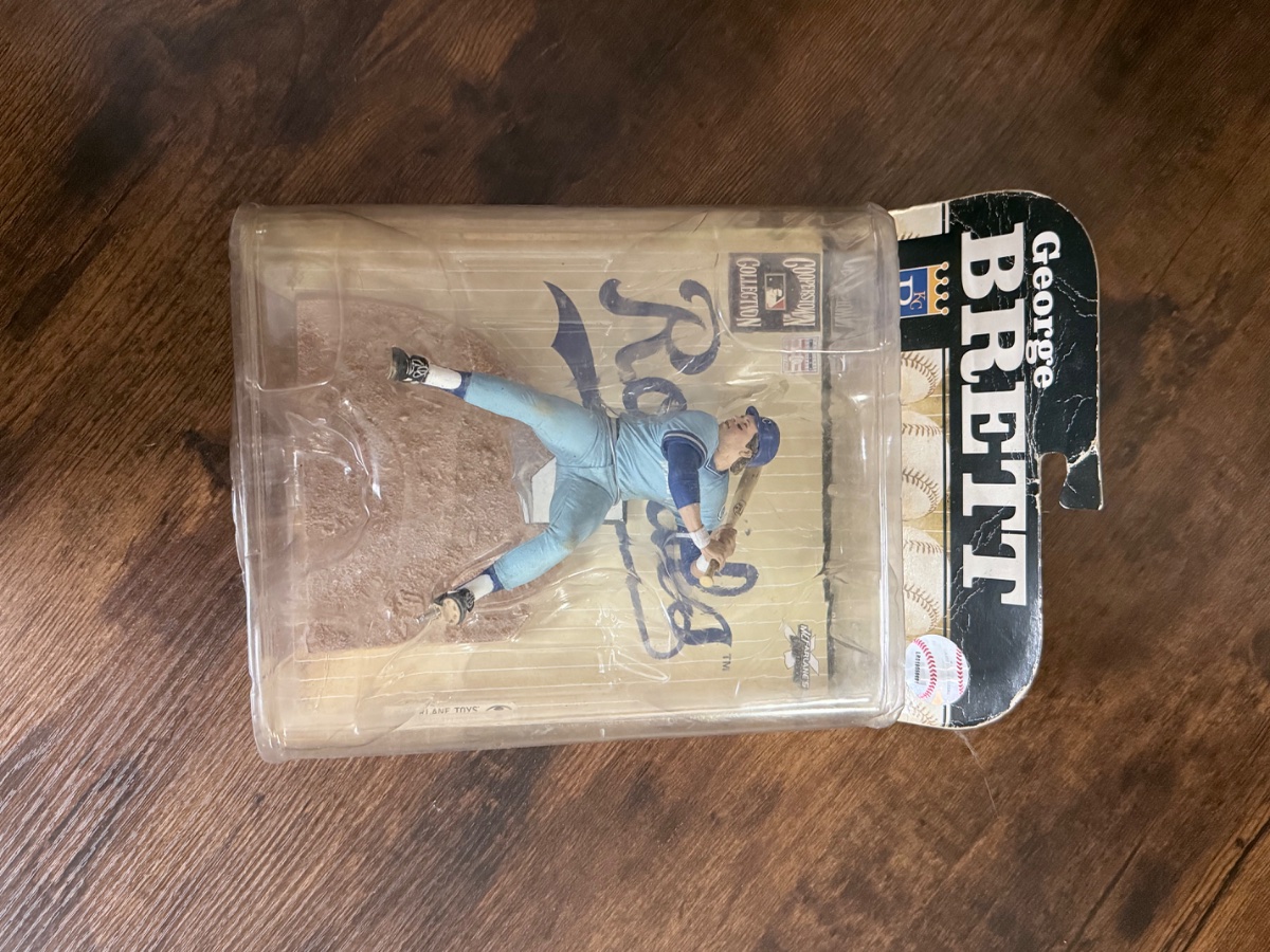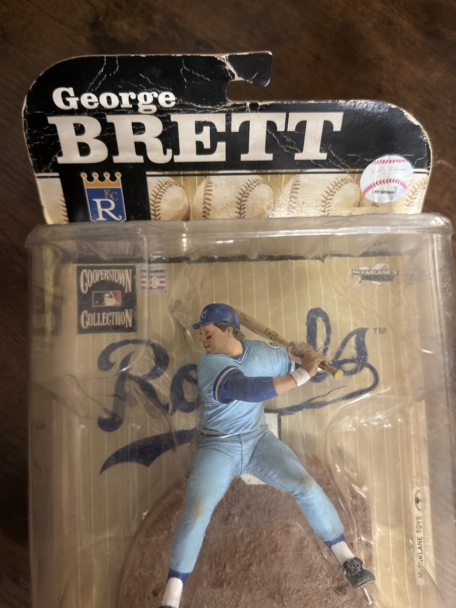 The packaging shows significant shelf wear, including heavy creasing and fraying at the top of the cardboard header. While George Brett is a top-tier legend, the value of McFarlane figures is heavily dependent on the condition of the packaging.