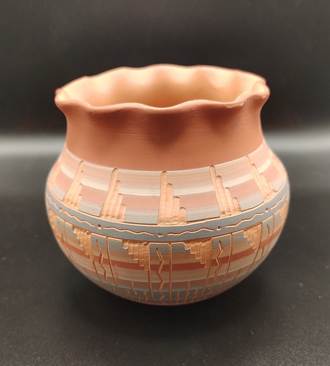 A beautiful example of Navajo sgraffito pottery featuring a ruffled 'pie crust' rim and intricate hand-etched geometric motifs.