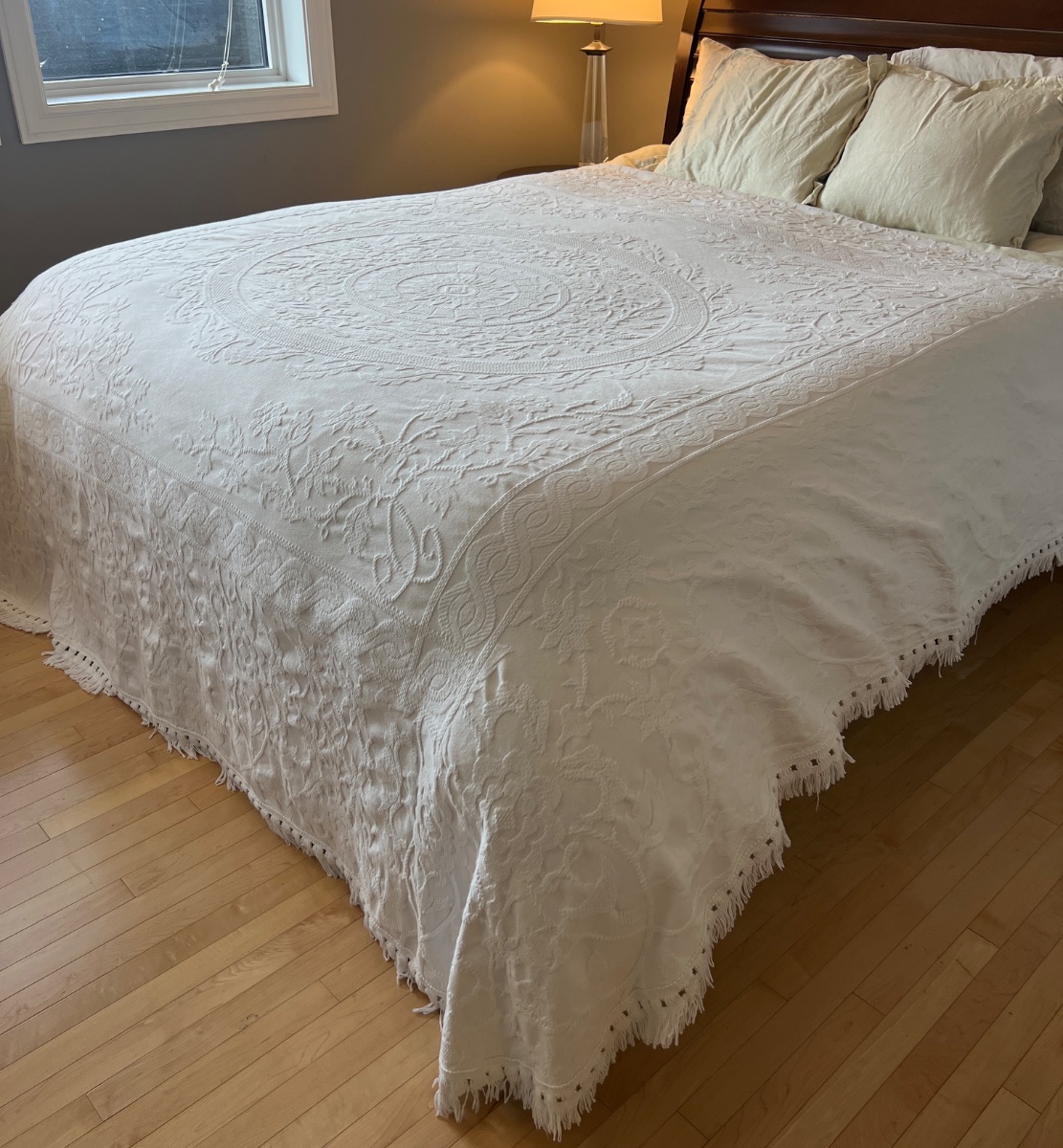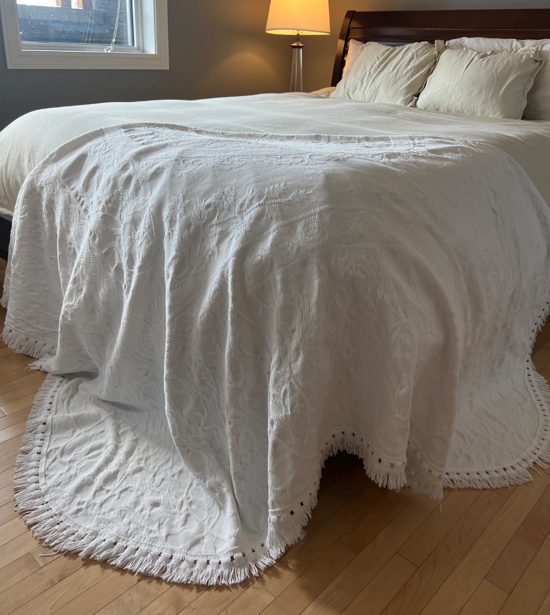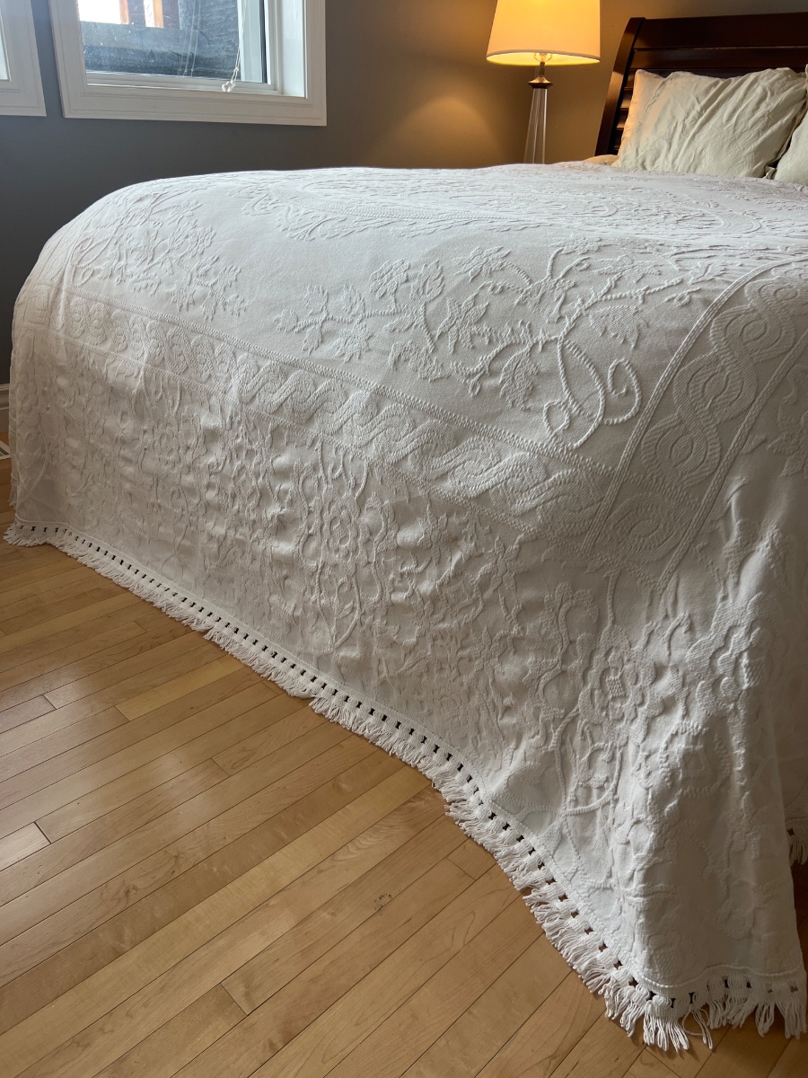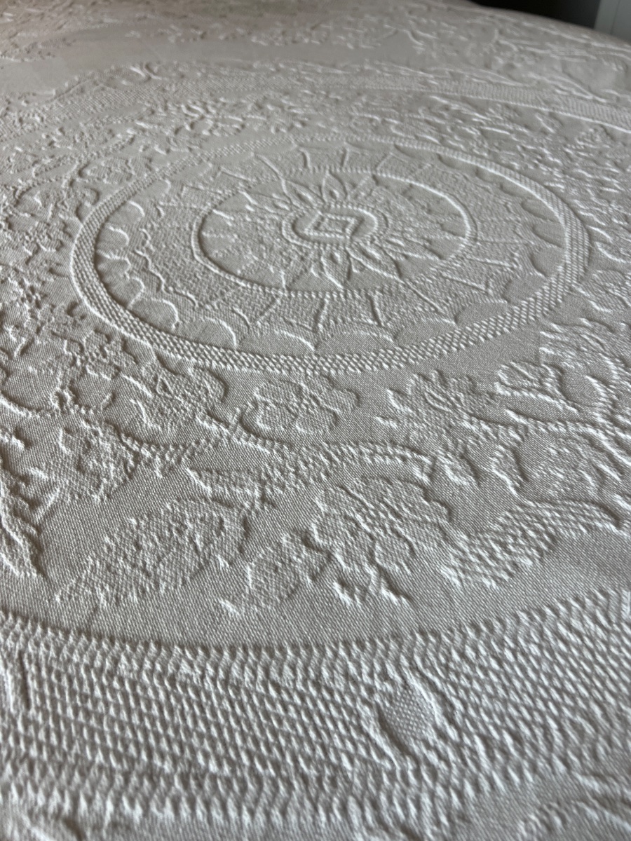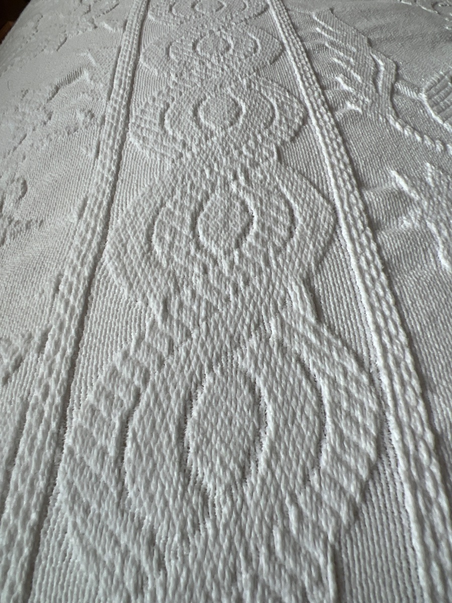 This is a classic loom-woven white bedspread, characterized by its heavy, embossed 'quilted' appearance known as Marseilles work or matelassé.