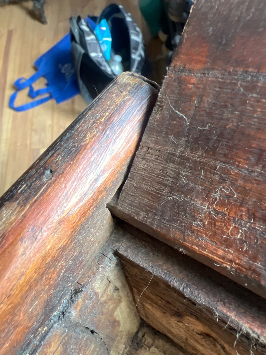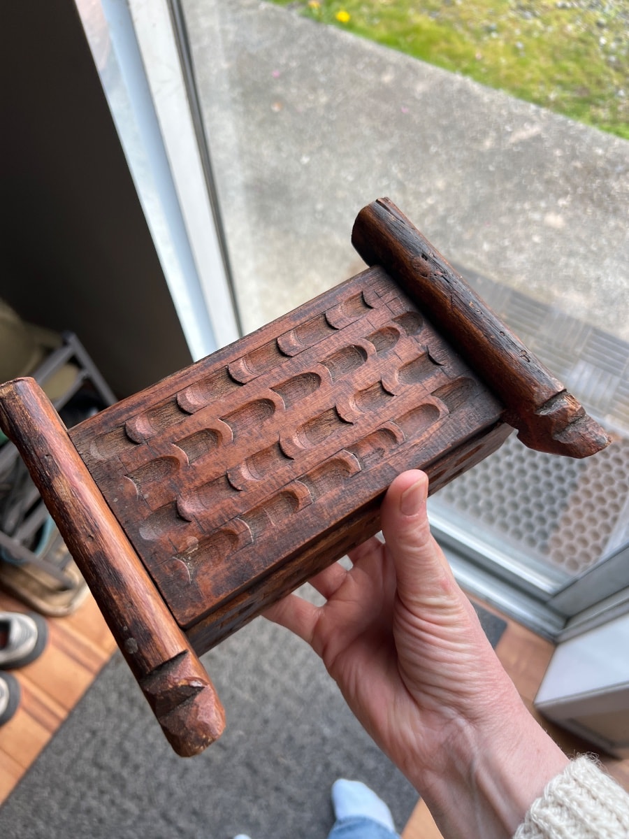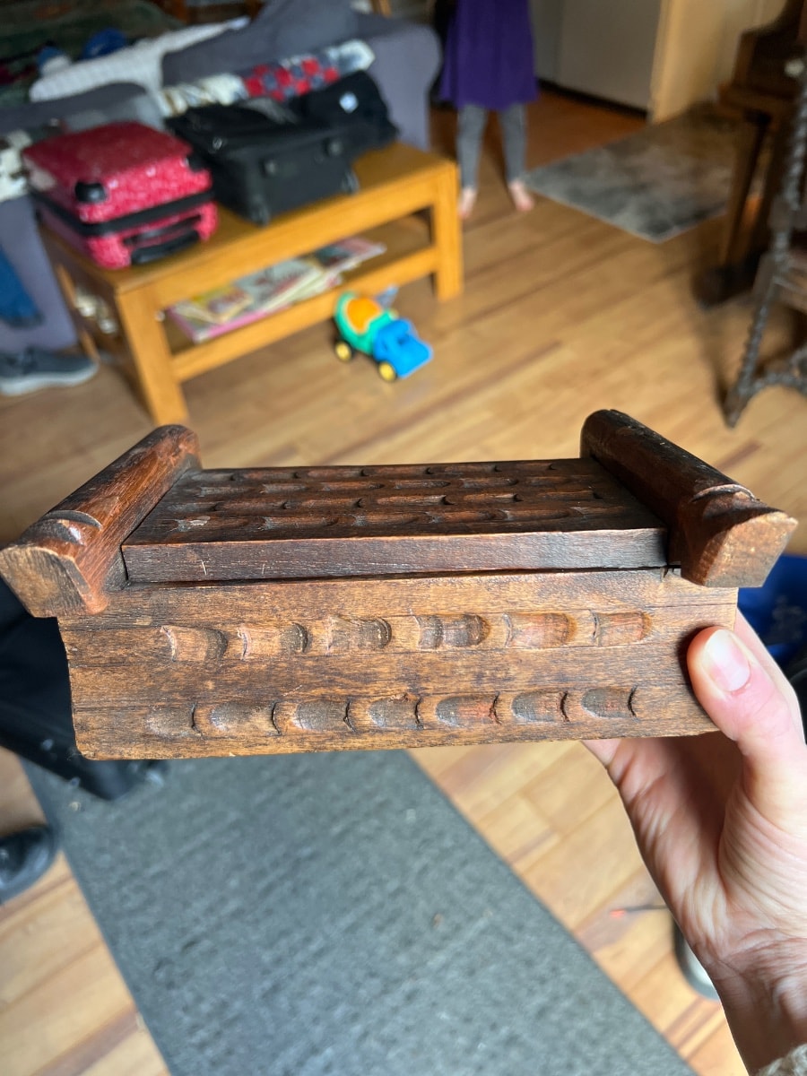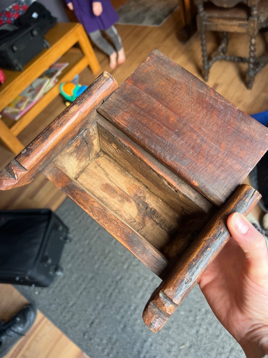 The box shows significant signs of age, including a deep, authentic patina and some chipping on the edges of the side rails. Value is driven by the authentic hand-carved texture and the presence of the original sliding lid, which is often lost.