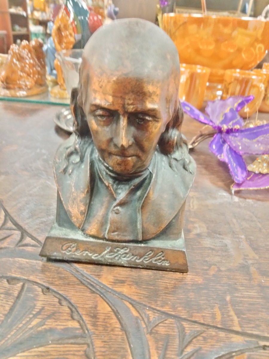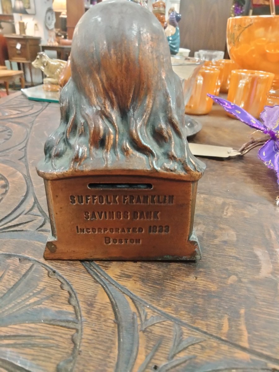 A cast metal promotional coin bank depicting a bust of Benjamin Franklin, finished with a copper-toned wash.
