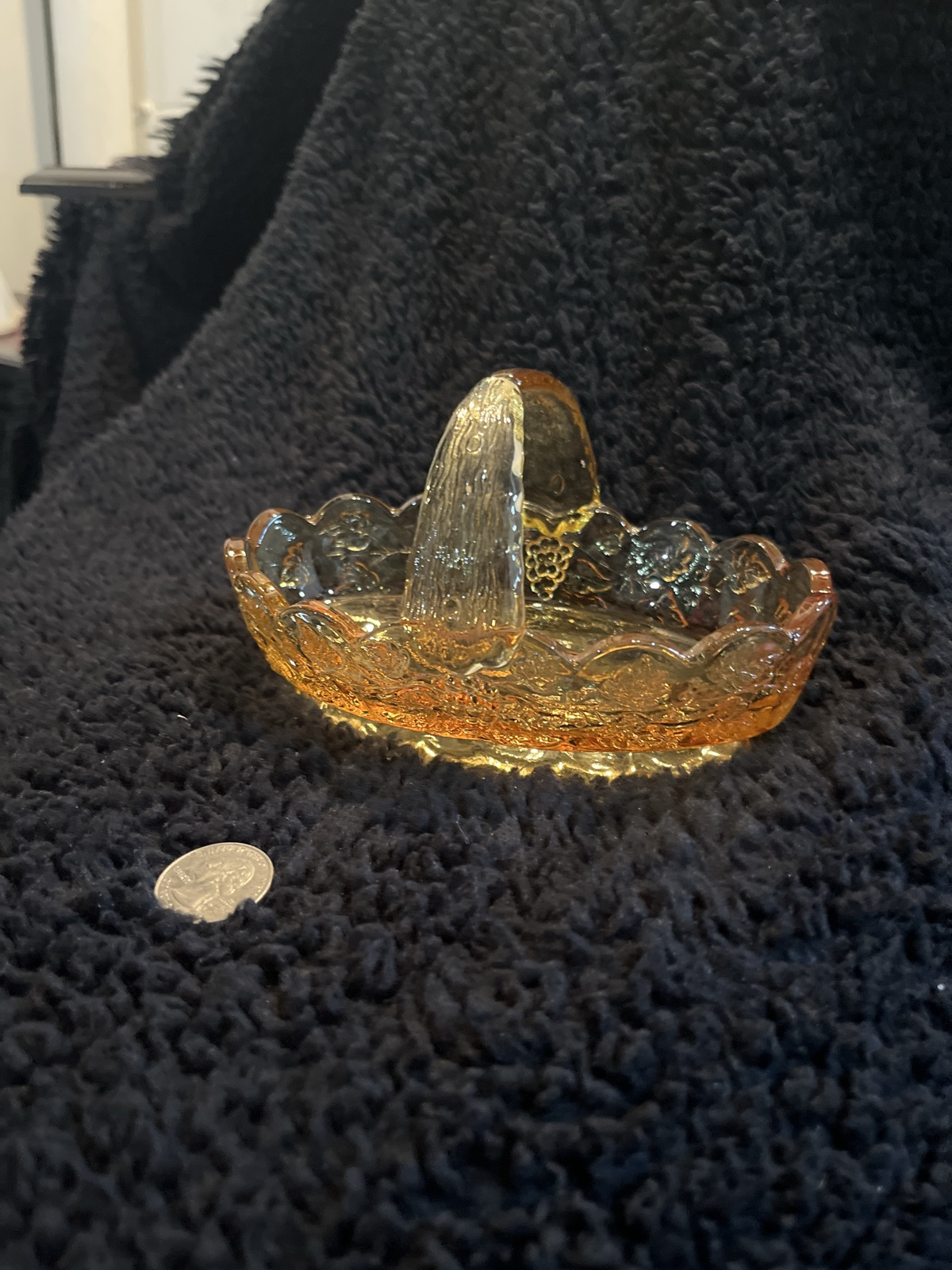 This is a classic piece of American pressed glass in a rich amber hue, featuring the popular 'Harvest' pattern of embossed grapes and vines.