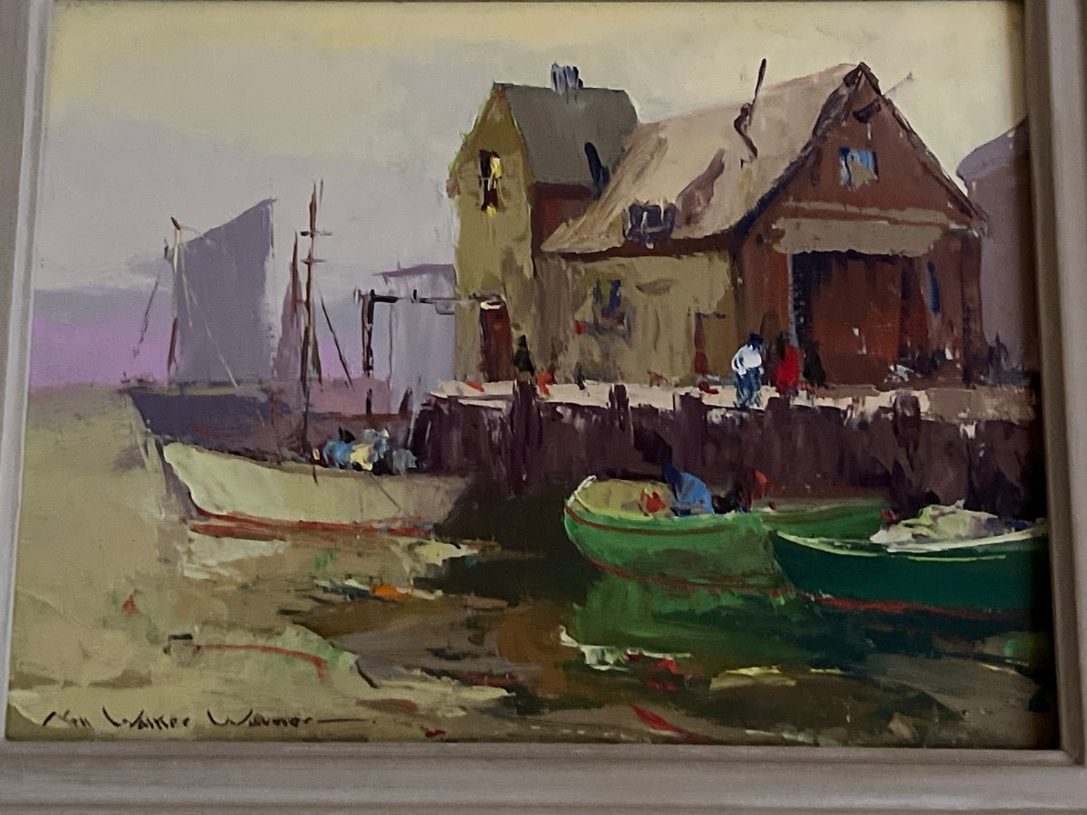 A vibrant, impasto-heavy oil painting on board depicting a bustling harbor scene, likely in Gloucester, Massachusetts or a California coastal town.